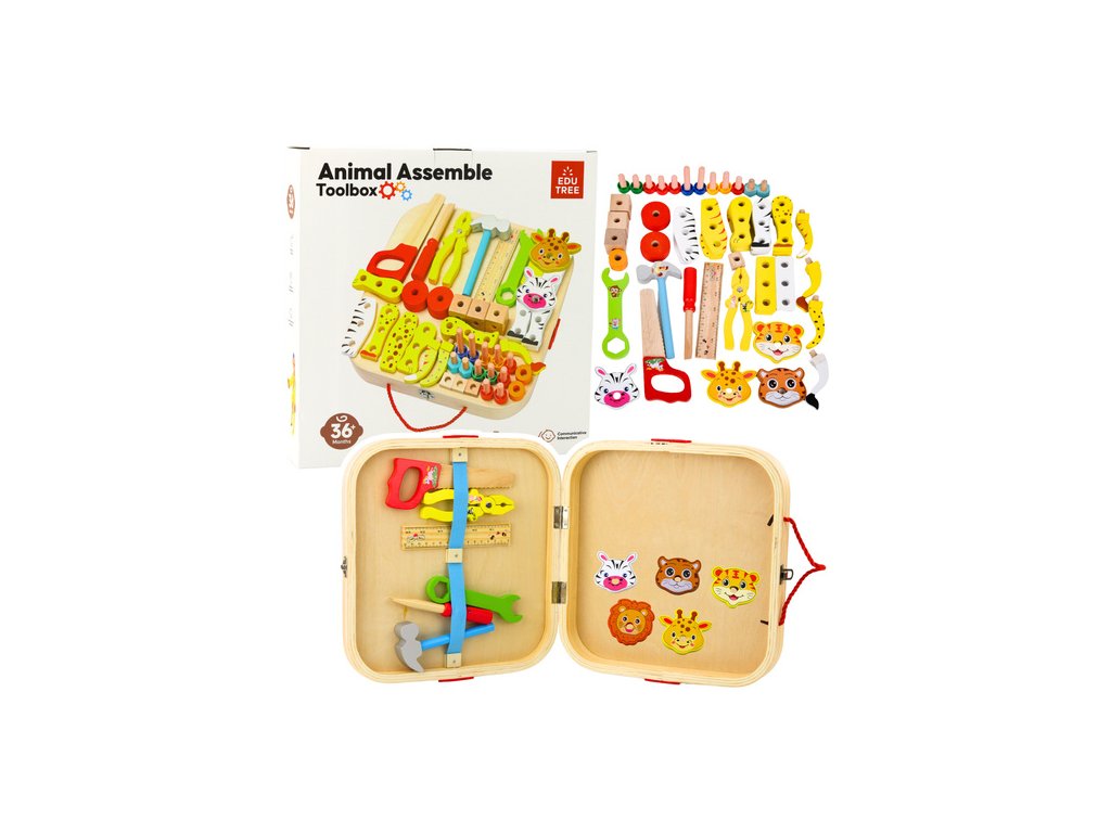 A készlet tartalmaz egy komplett alapvető szerszámkészletet, mint például fűrészt, kalapácsot, csavarhúzót, villáskulcsot, fogót és vonalzót , valamint számos színes összeszerelő elemet - csavarokat, anyákat és lyukas fakockákat , amelyeket a gyermek tetszés szerint elcsavarhat és összeilleszthet.
