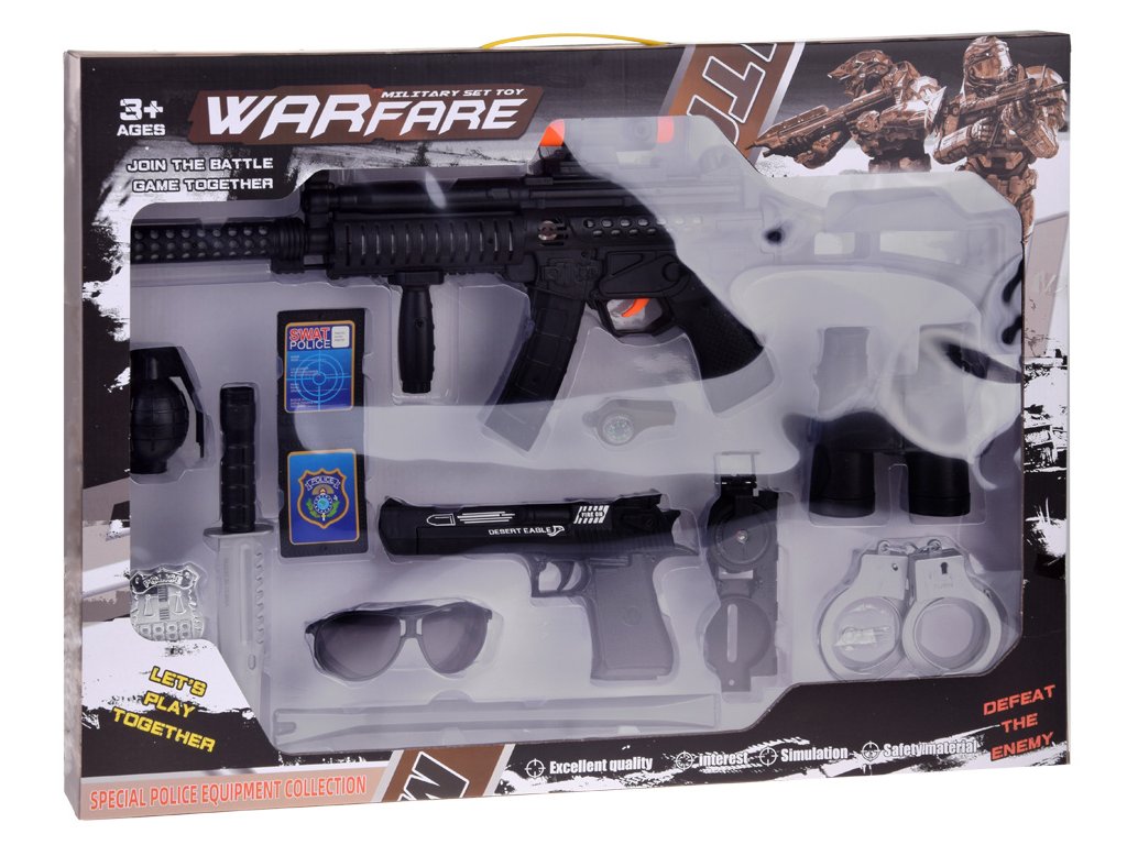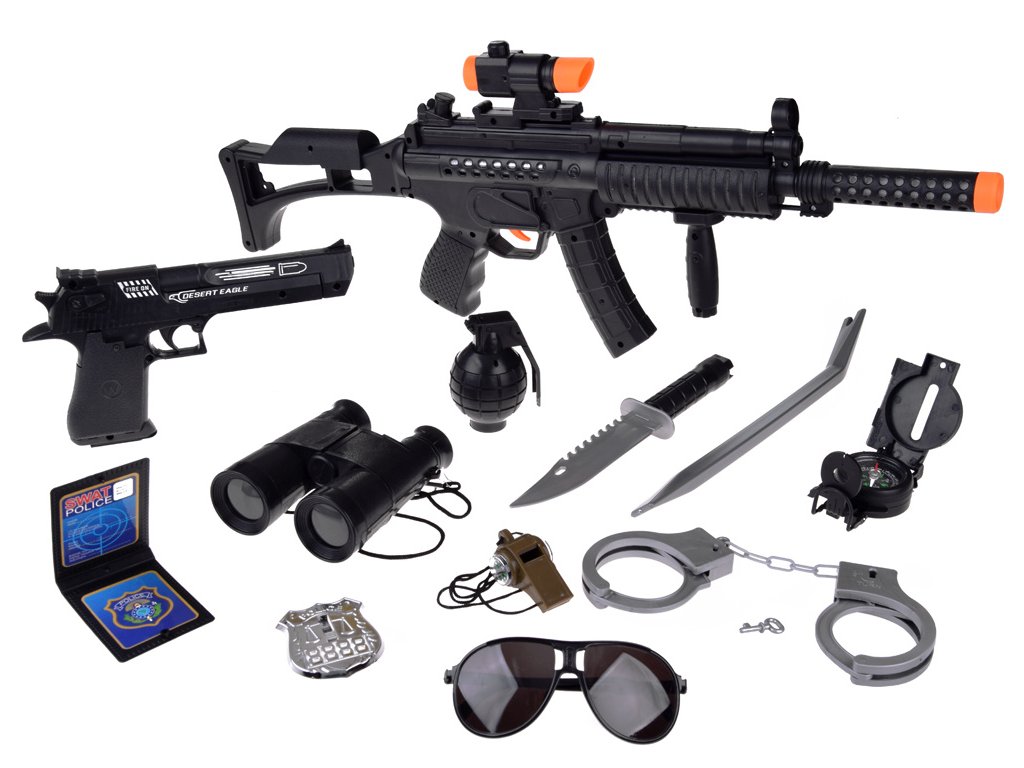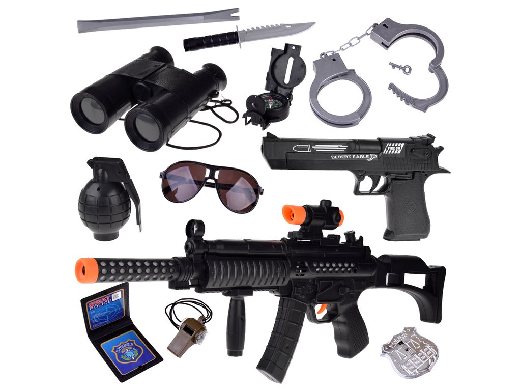 Kompletní sada pro policistu skládající se z 12 nezbytných doplňků umožní vašemu dítěti skvělou zábavu v roli strážce zákona. Sada obsahuje veškeré potřebné doplňky, aby se stalo policistou nebo policistkou, a mohla se vtělit do služby v uniformě. Bohatě vybavena až 12 protiteroristickými doplňky, přinese vašemu dítěti nádherné chvíle radostné zábavy. Můžete zde najít pušku s efektovými zvuky a světly, kde po stisknutí spouště policista uslyší zvuk výstřelu, zatímco pistole má pouze jeden výstřel. V sadě samozřejmě nechybí ani granát, který po stisknutí spouště simuluje výbuch.