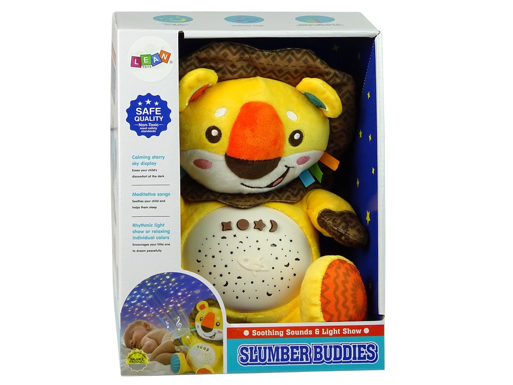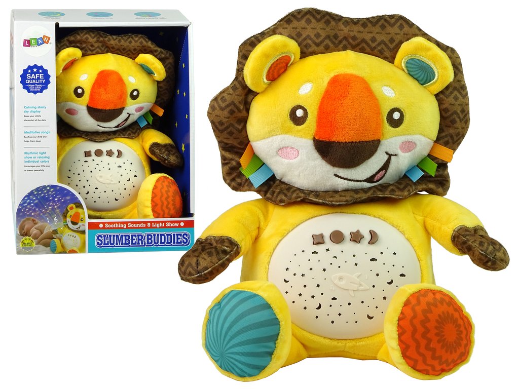 Az oroszlán beépített kivetítővel rendelkezik, amely megjeleníti a csillagok változó színét a falakon vagy a mennyezeten. Az este harmóniát és varázslatos hangulatot teremt gyermeke szobájában. A zenés plüss csillagprojektor minden korosztály számára megfelelő játék.