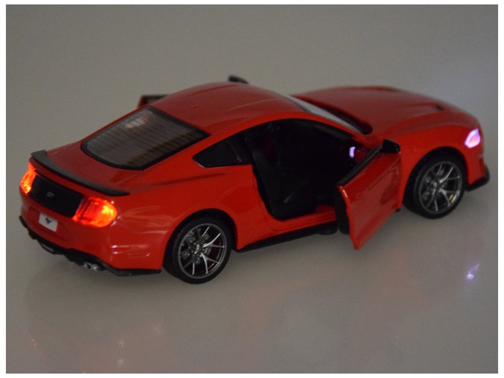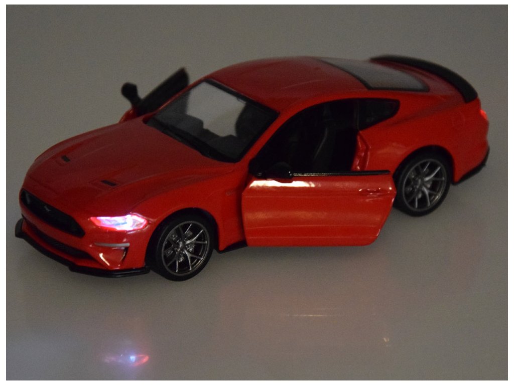 Po otevření dveří hracího modelu Ford Mustang GT uslyšíte zvuk klaksonu a alarmu. Když vozidlo stlačíte k podloží, spustí se zvuk startu a chodu motoru. Světla vpředu a vzadu vozidla dodávají zvukovým efektům šmrnc. Celé vozidlo má kovovou karoserii, gumové pneumatiky a plastový podvozek.