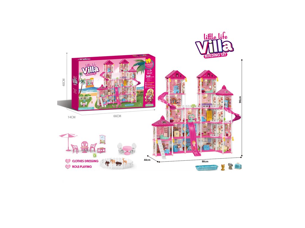 A bájos rózsaszín kastély a kis hercegnőknek hihetetlen, 368 darabot és gazdag kiegészítőket kínál, amelyekkel egy teljes babavilág hozható létre. A 98 cm széles, háromemeletes épület lenyűgöző dizájnnal, csúszdákkal, erkélyekkel, felszerelt szobákkal és LED-lámpákkal rendelkezik, amelyek varázslatos hangulatot kölcsönöznek az épületnek.