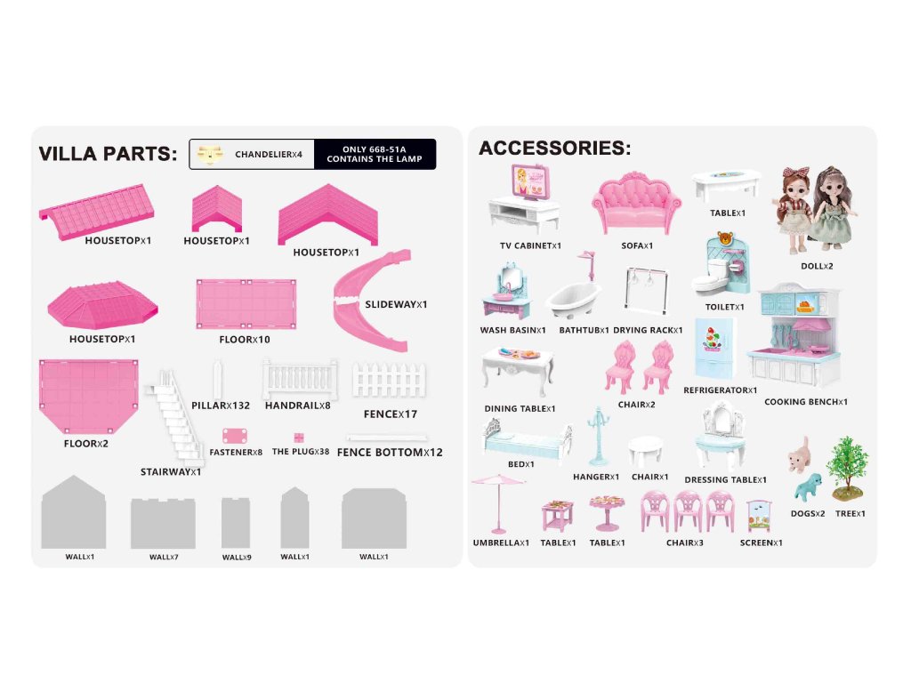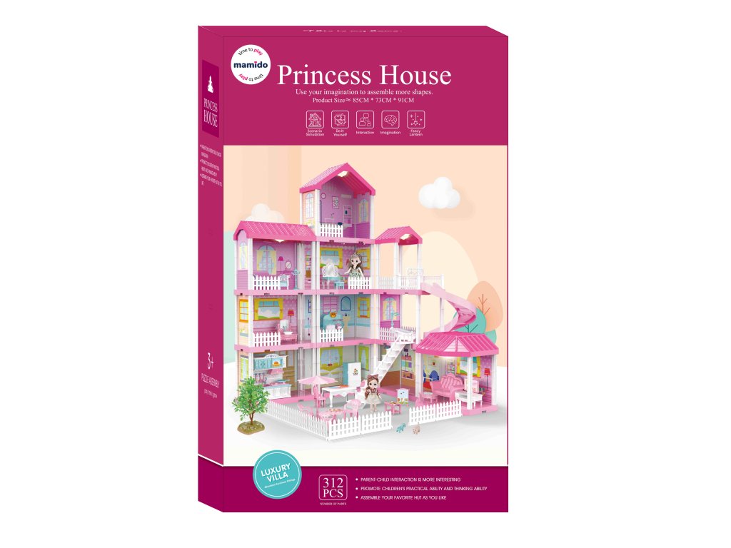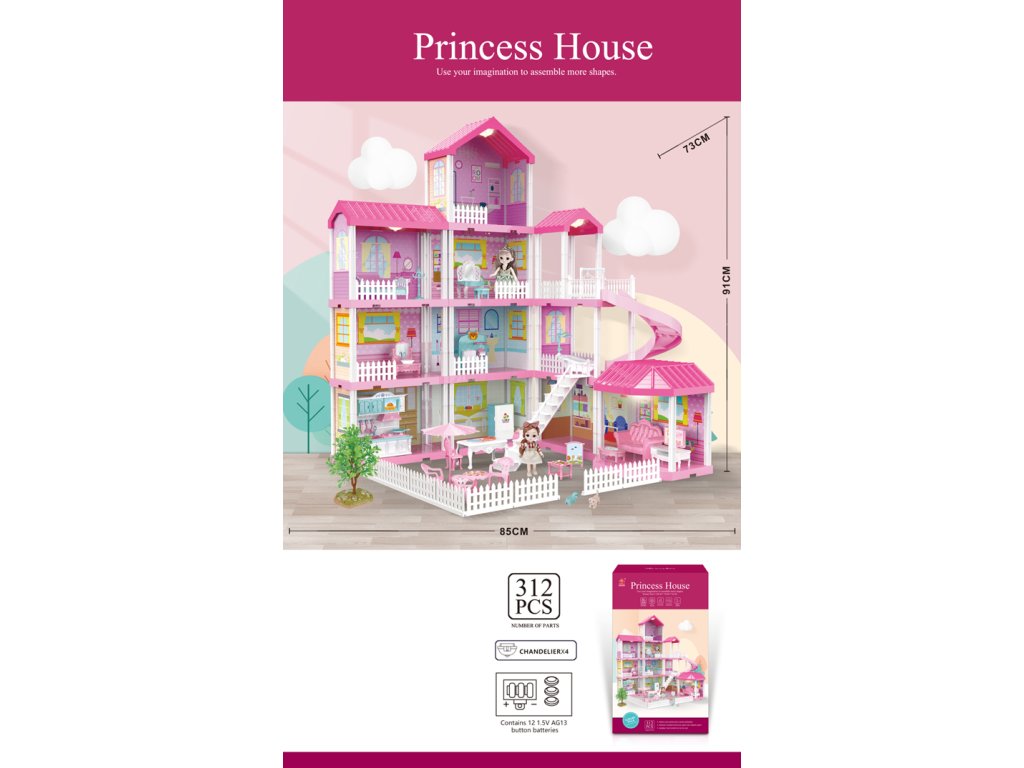 A kastély 312 darabból áll, amelyek lehetővé teszik egy részletgazdagon berendezett ház felépítését rengeteg szobával – hálószobával, nappalival, fürdőszobával, konyhával és kültéri ülősarokkal. A LED csillároknak köszönhetően a házikó világíthat, így a gyerekek sötétben is játszhatnak. A babák leültethetők, felöltöztethetők és az egyes szobákba helyezhetők, ami tovább ösztönzi a képzeletet és a történetmesélő játékokat.