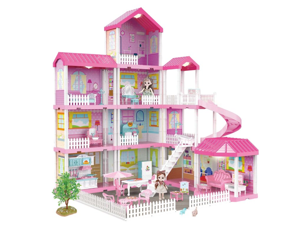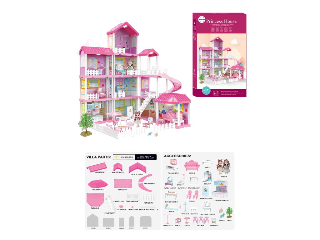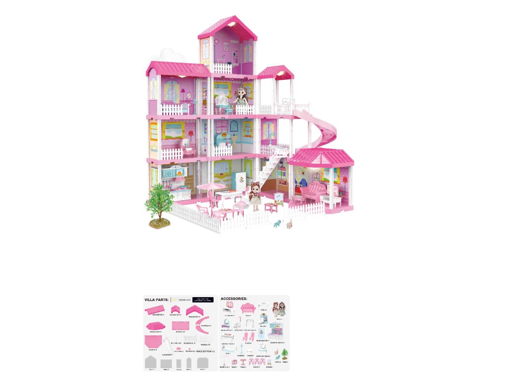 A nagy rózsaszín villa végtelen játékmódot kínál a gyerekeknek! A 91 cm magas, háromemeletes ház kerttel, terasszal, pavilonnal és spirálcsúszdával ideális a kreatív játékhoz. Tartozik hozzá 2 baba és LED világítás is, amely varázslatos hangulatot kölcsönöz az egész háznak.