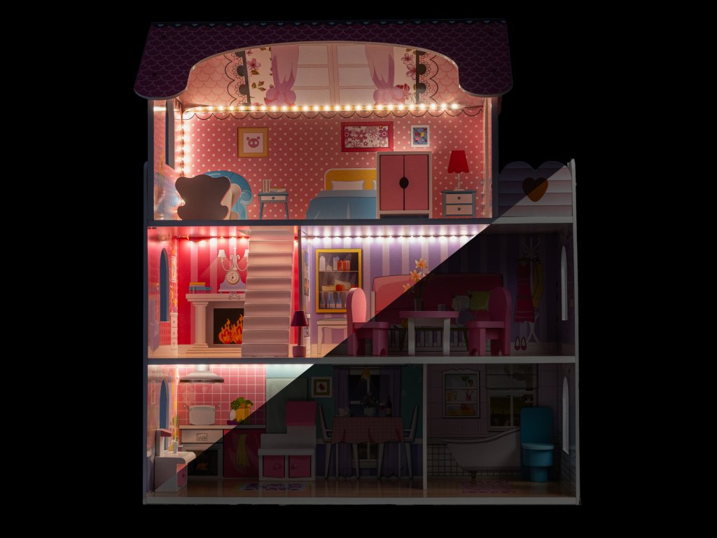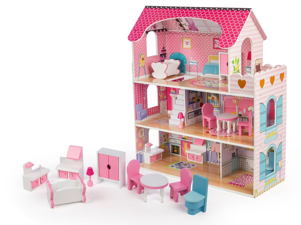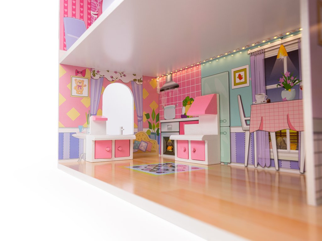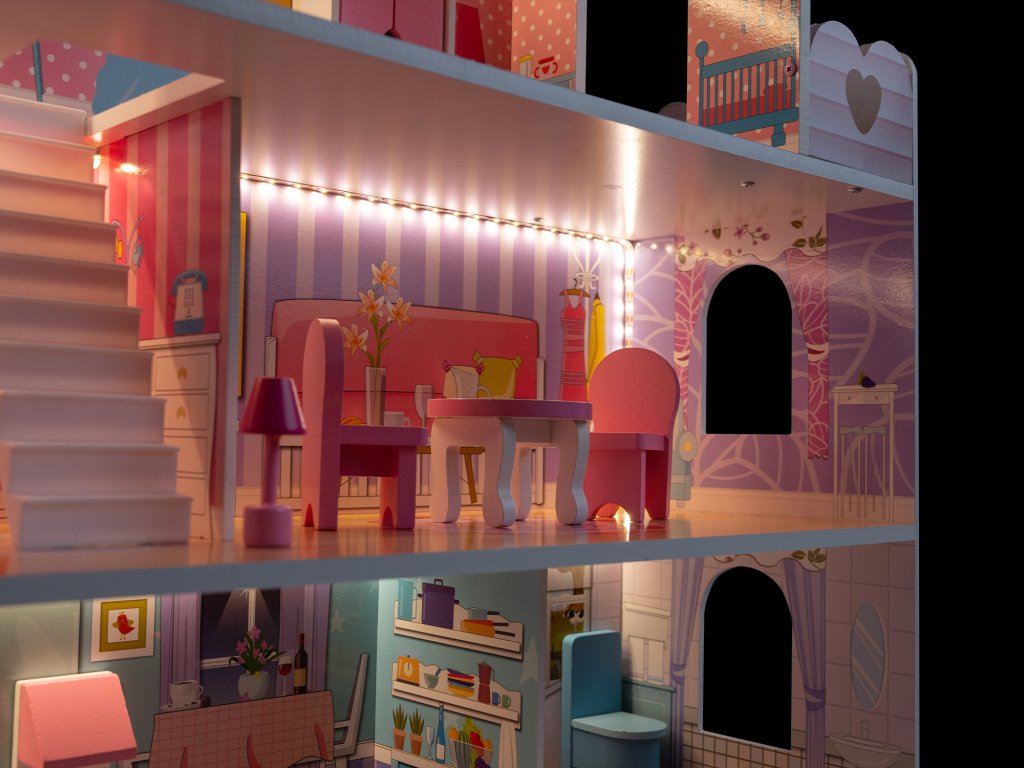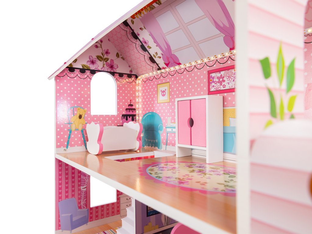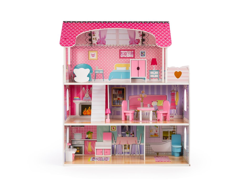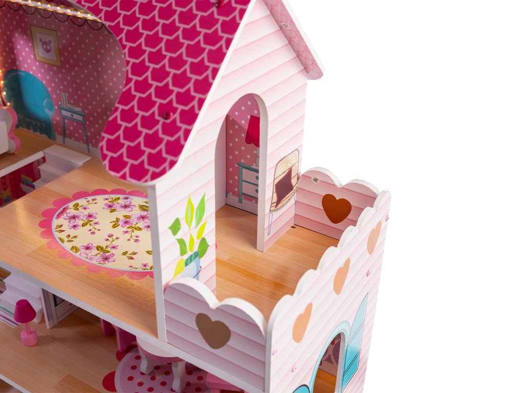 Hozz létre egy varázslatos világot, tele képzelettel és szórakozással a gyerekek számára ezzel az elegáns babaházzal. Időtlen rózsaszín és fehér dizájnja színes részletekkel kiegészítve minden gyerekszobát feldob és kreatív játékra ösztönöz.