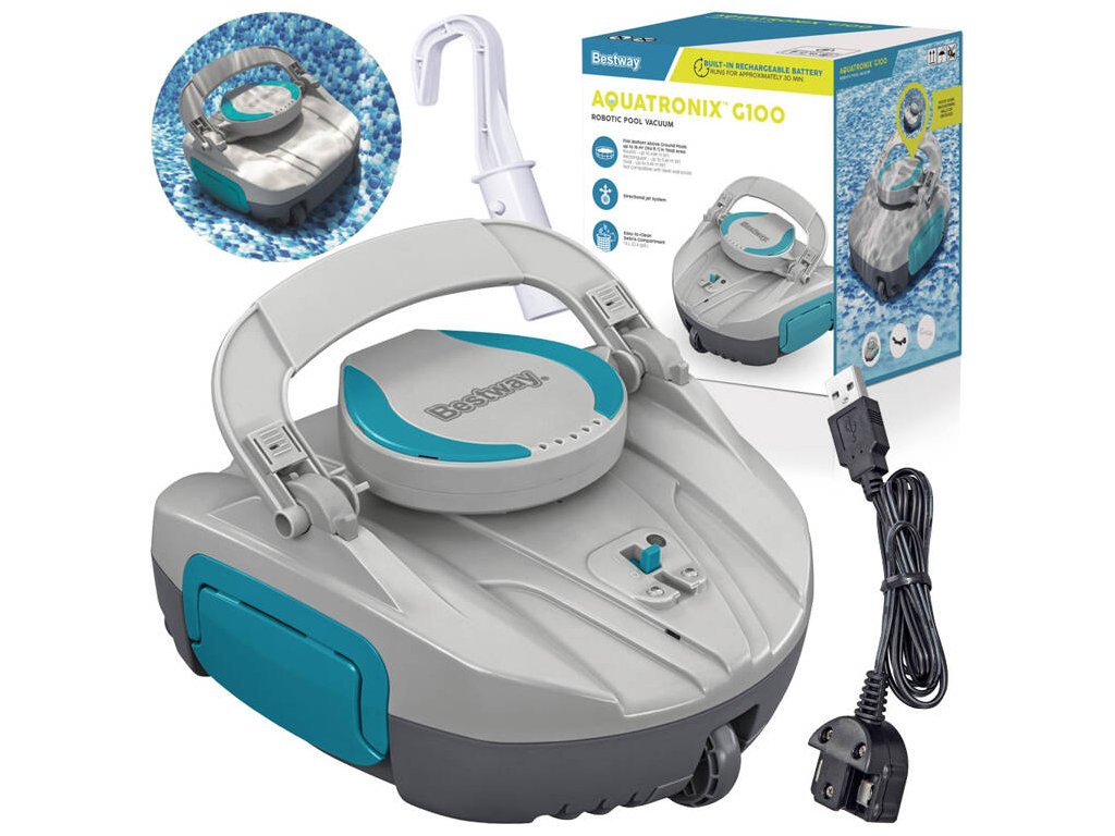 Bazénový vysavač AquaTronix G100 od společnosti Bestway je moderní automatické řešení pro čištění nadzemních bazénů s plochým dnem. Díky bezdrátové konstrukci a vestavěnému akumulátoru se obejde bez připojování kabelů či hadic, což umožňuje snadnou manipulaci a efektivní údržbu bazénu.