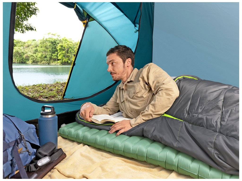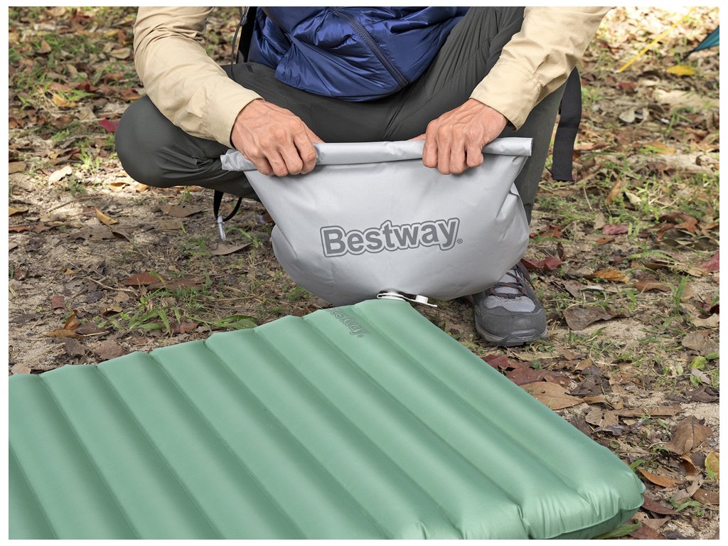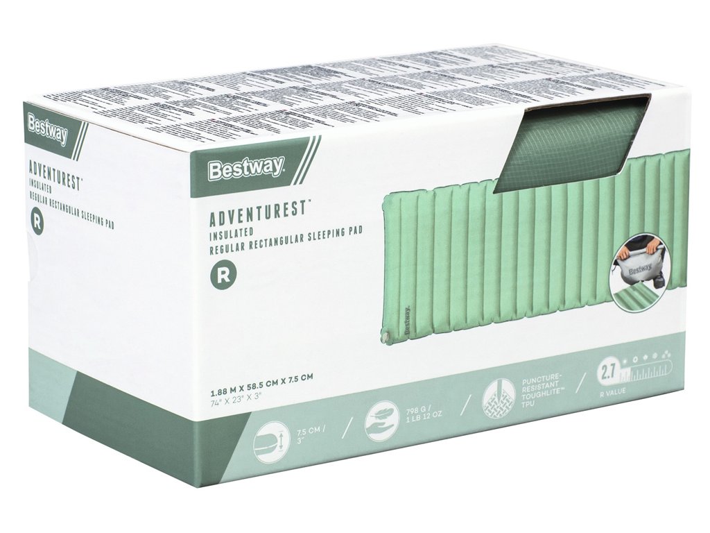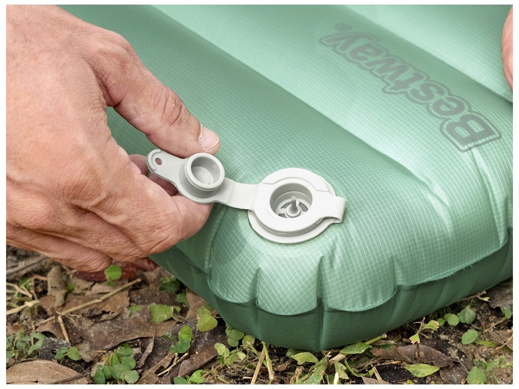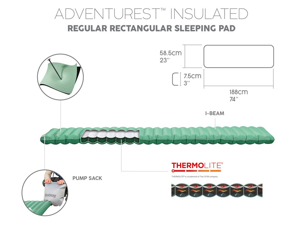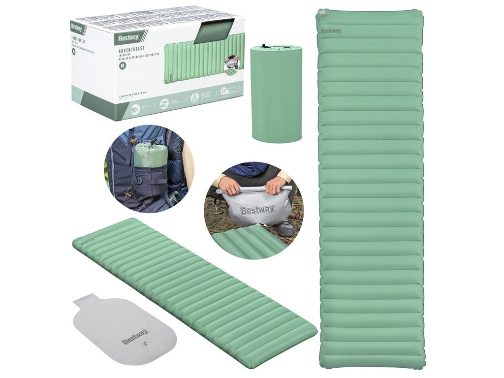 A Bestway AdventuRest túraszőnyeg ideális megoldás mindazok számára, akik értékelik a kényelmes pihenést napozás, sátorozás vagy egyszerűen csak a szabad levegőn, sátorban való alvás közben. A téglalap alakú betét tökéletesen illeszkedik a közepes méretű hálózsákokba. Ennek a szőnyegnek az előnye a könnyű és gyors felfújás az innovatív AirCinch ™ rendszernek köszönhetően. A felfújás zacskó segítségével történik, csak kézzel kell megnyomni (gyártói információ), hogy a szőnyeg megteljen levegővel. Nem kell attól tartania, hogy elfelejti becsomagolni a pumpát, mert ez a készlet kész. Ha a szőnyeg elérte a kívánt felfújási szintet, zárja el a szelepet, és élvezze a pihenést.