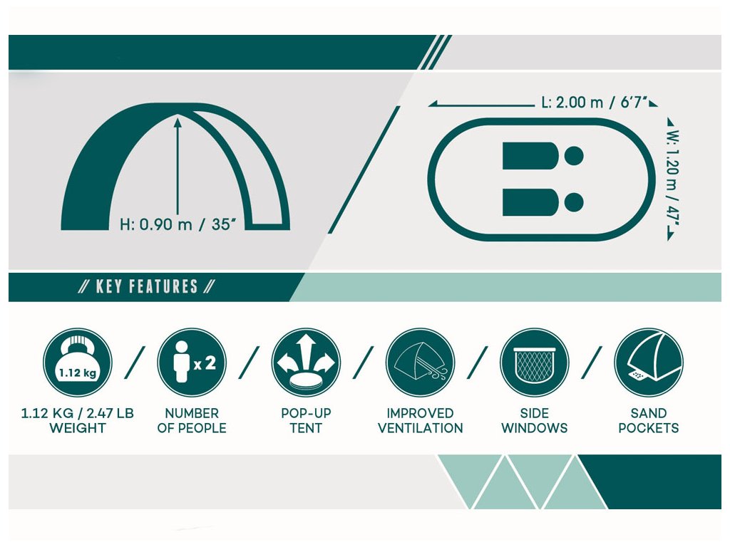 Ezt a strandsátort azokra tervezték, akik nem szeretnek közvetlen napfénynek lenni a tengerparton. A strandsátrak egyszerű megoldást kínálnak az árnyékolásra a forró nyári napokon, és kiválóan alkalmasak az összes strandkellék egy helyen történő tárolására.