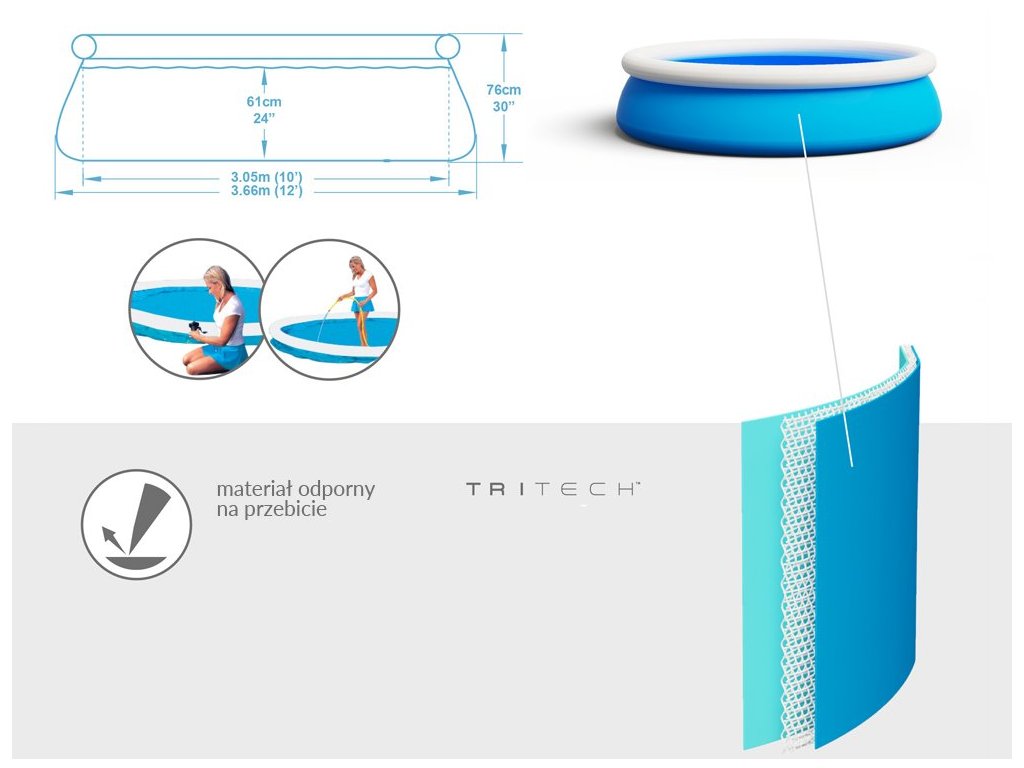 Trojité, velmi odolné boční stěny z materiálu Tritech™ - kombinace PVC a polyesteru. Vnitřní konstrukce je podporována nafukovacím kruhem. Extrémně snadná a rychlá montáž, která obvykle 2-3 osobám trvá asi 10 minut.