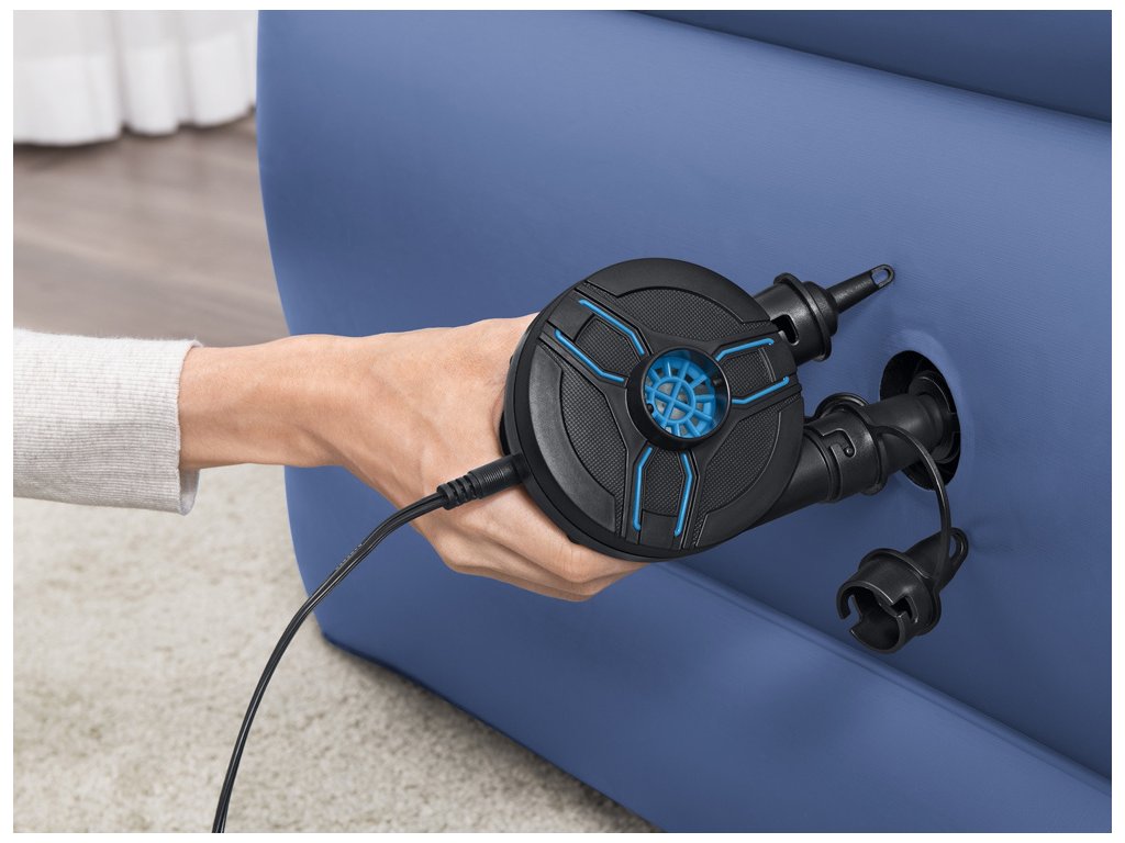 A szivattyú táplálható 100-240V-os háztartási vagy 12V-os autós aljzatról. Nagy kamrával rendelkezik, amely biztosítja a gyors felfújást.