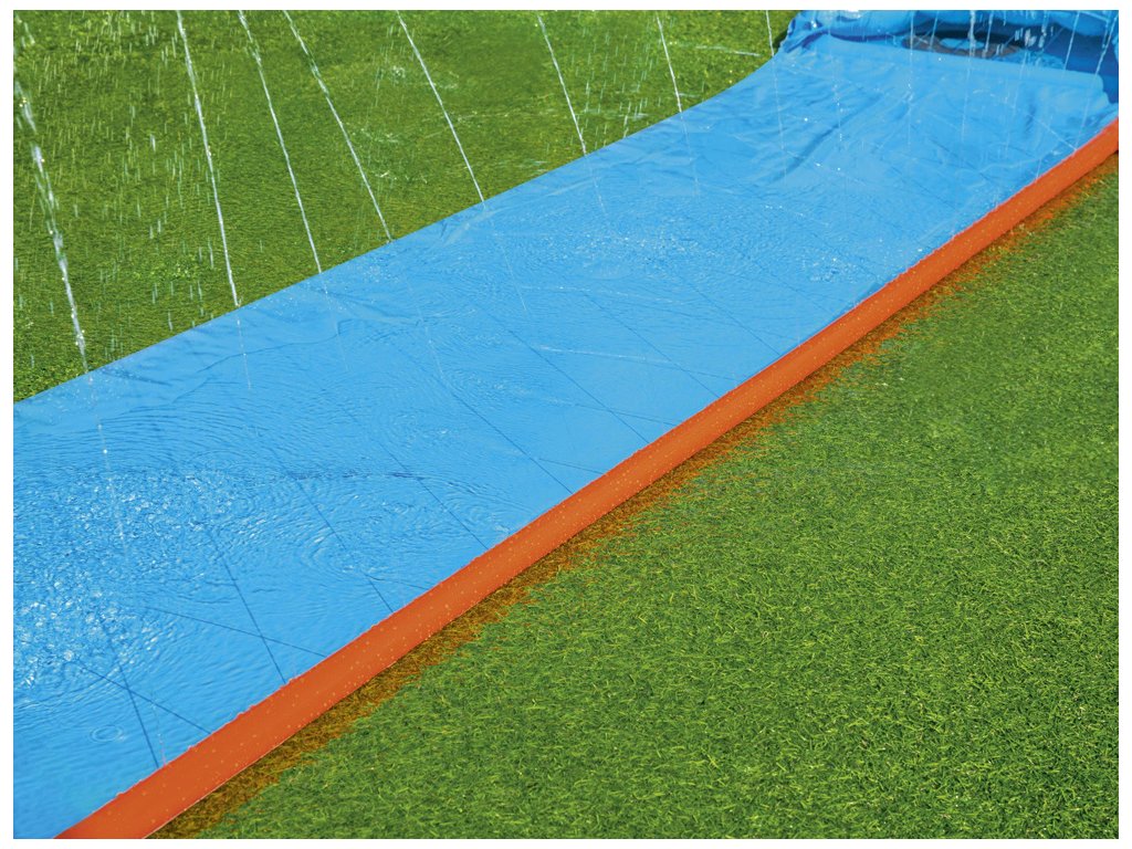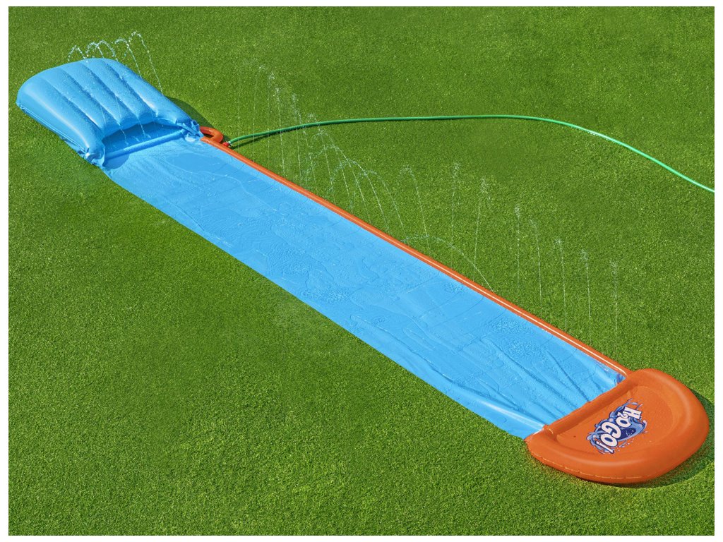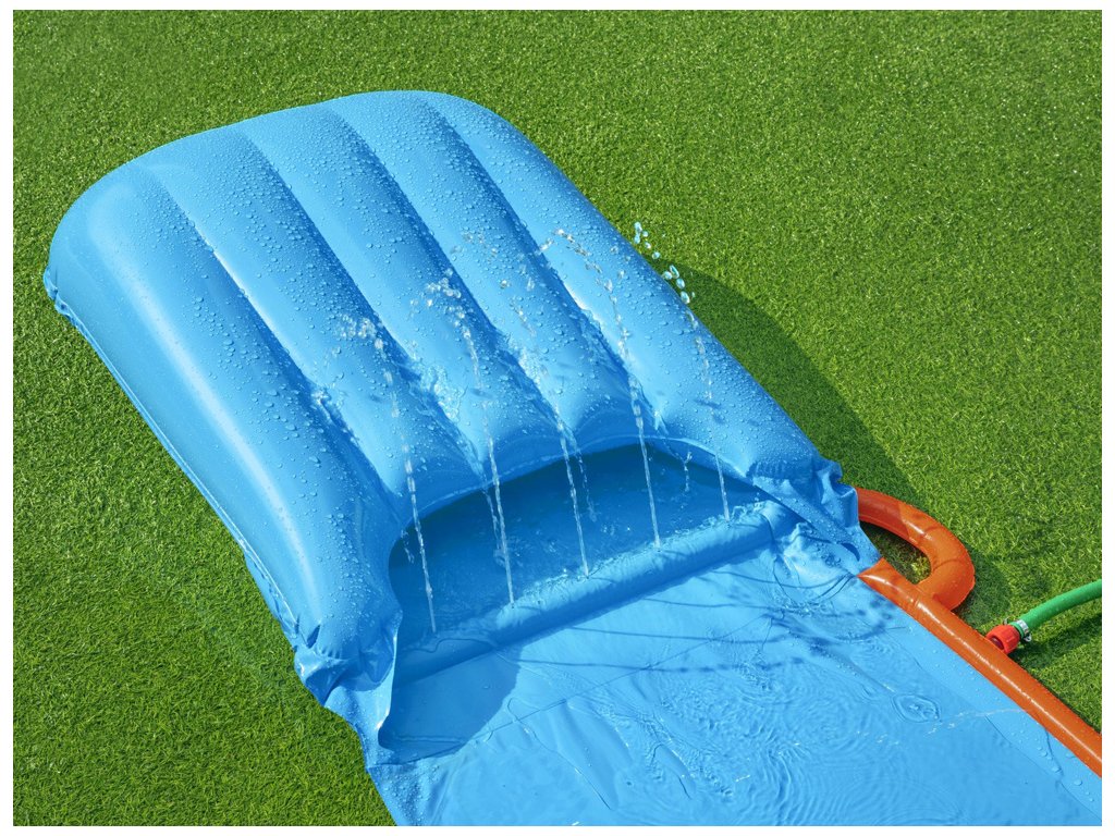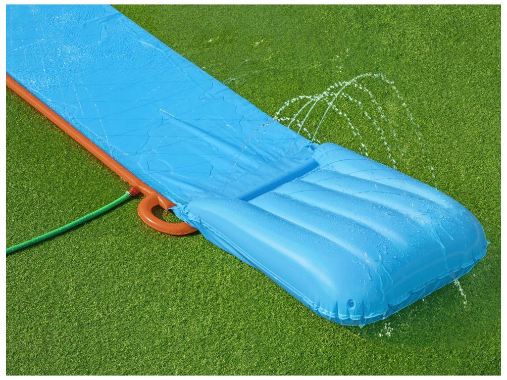 Vodní skluzavka H2O GO! Bestway je určena pro ty, kteří milují skvělou zábavu na čerstvém vzduchu. Dráha je zavlažována pomocí sprch, které jsou umístěny na skluzavce a fungují po připojení zahradní hadice k speciálním konektorům. Vodní sprchy integrované do skluzavky zajišťují maximální kluzkost, stékající voda udržuje skluzavku čistou a proudy vody poskytují osvěžení v horkých dnech. Díky promyšlené konstrukci se stékající voda shromažďuje na konci nafukovací mety, čímž zajišťuje měkké brzdění s velkým šplouchnutím! Moderní konstrukce a odolný, testovaný materiál použitý k výrobě skluzavky zaručují snadnou a bezproblémovou údržbu. Stačí rozložit skluzavku a uspořádat veselý závod, kdo první, ten vyhrává! Nepřekonatelná zábava zaručena!