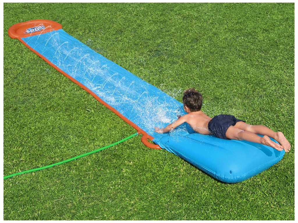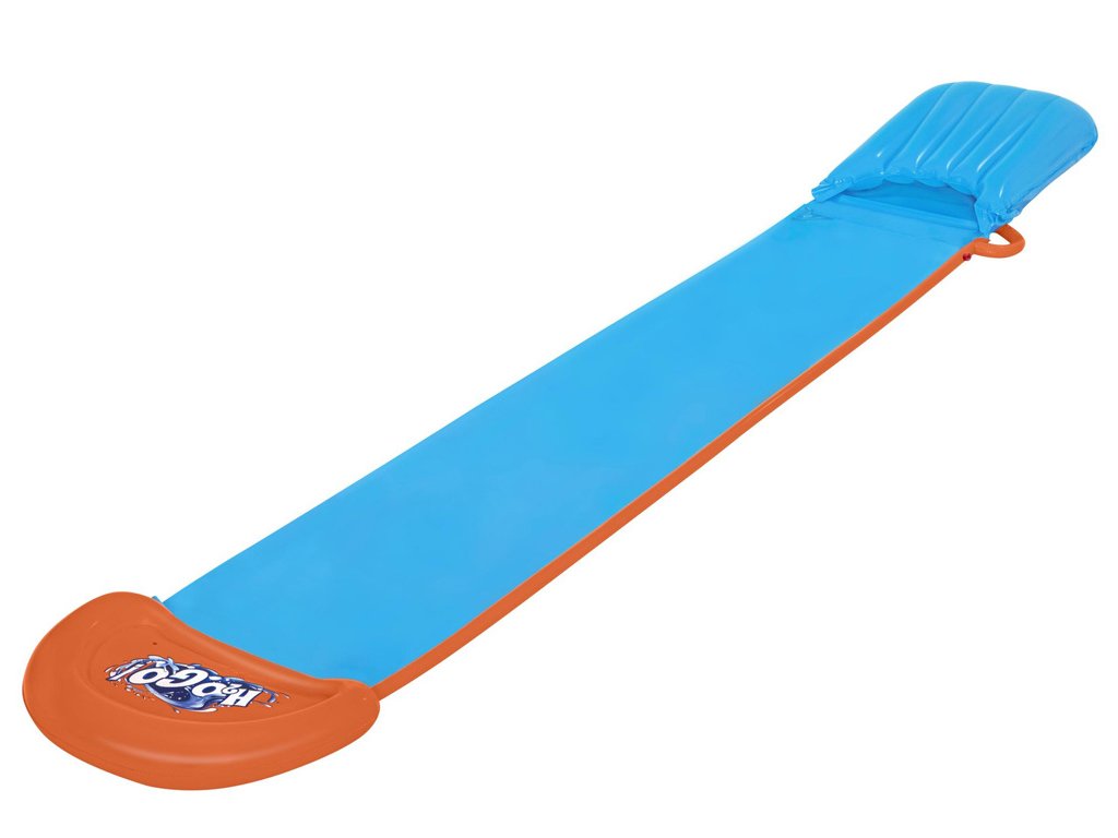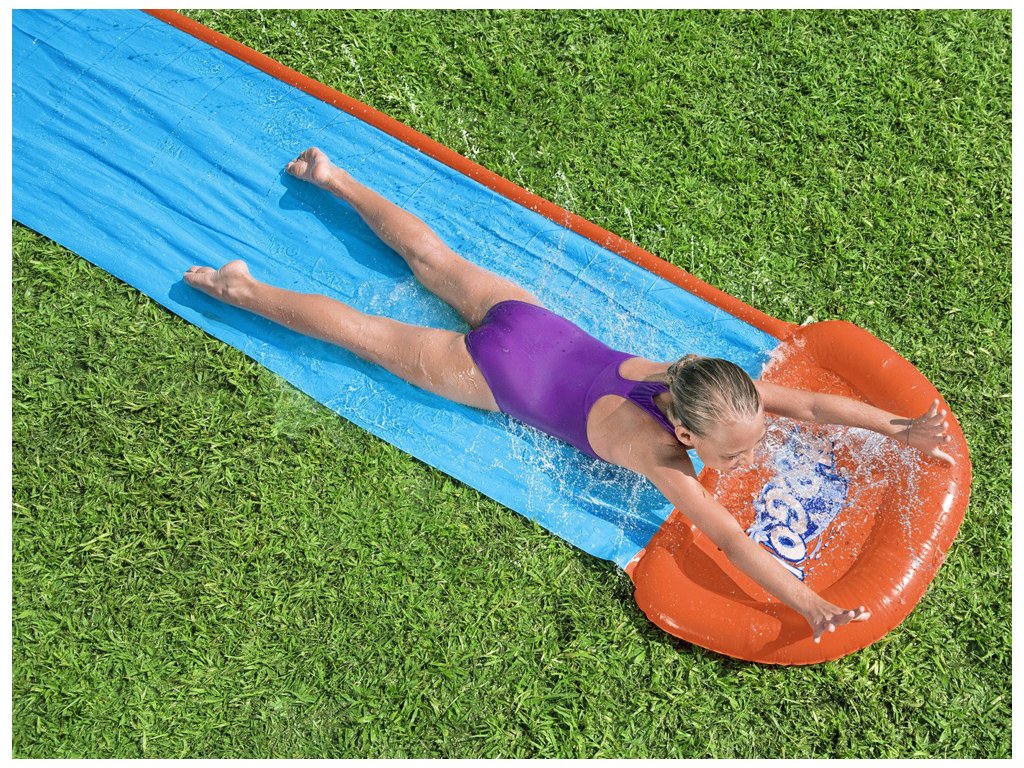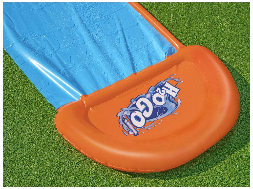 Vodní skluzavka H2O GO! Bestway je určena pro ty, kteří milují skvělou zábavu na čerstvém vzduchu. Dráha je zavlažována pomocí sprch, které jsou umístěny na skluzavce a fungují po připojení zahradní hadice k speciálním konektorům. Vodní sprchy integrované do skluzavky zajišťují maximální kluzkost, stékající voda udržuje skluzavku čistou a proudy vody poskytují osvěžení v horkých dnech. Díky promyšlené konstrukci se stékající voda shromažďuje na konci nafukovací mety, čímž zajišťuje měkké brzdění s velkým šplouchnutím! Moderní konstrukce a odolný, testovaný materiál použitý k výrobě skluzavky zaručují snadnou a bezproblémovou údržbu. Stačí rozložit skluzavku a uspořádat veselý závod, kdo první, ten vyhrává! Nepřekonatelná zábava zaručena!