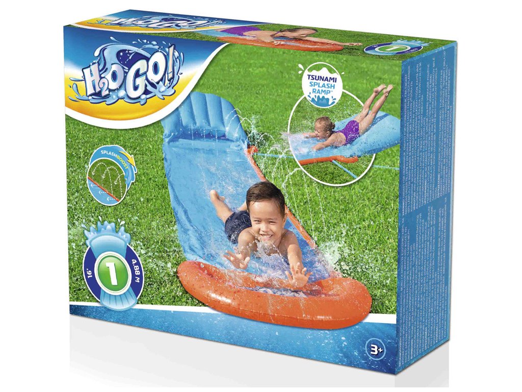 Vodní skluzavka s rychlostní rampou model Tsunami je nabídkou od Bestway na toto léto pro všechny děti, které neznají nudu! Efektní, jednoduchá skluzavka s odrazovou podložkou umožní každému nabrat rychlost, aby stylově přelétl celou vodní dráhu a zastavil na měkkém cíli. Tsunami Splash Ramp™ zajišťuje měkké přistání a vytváří vodní vlny stékající po skluzavce, což poskytuje ještě větší kluzkost a veselý šplouch!