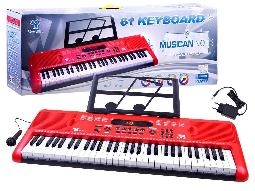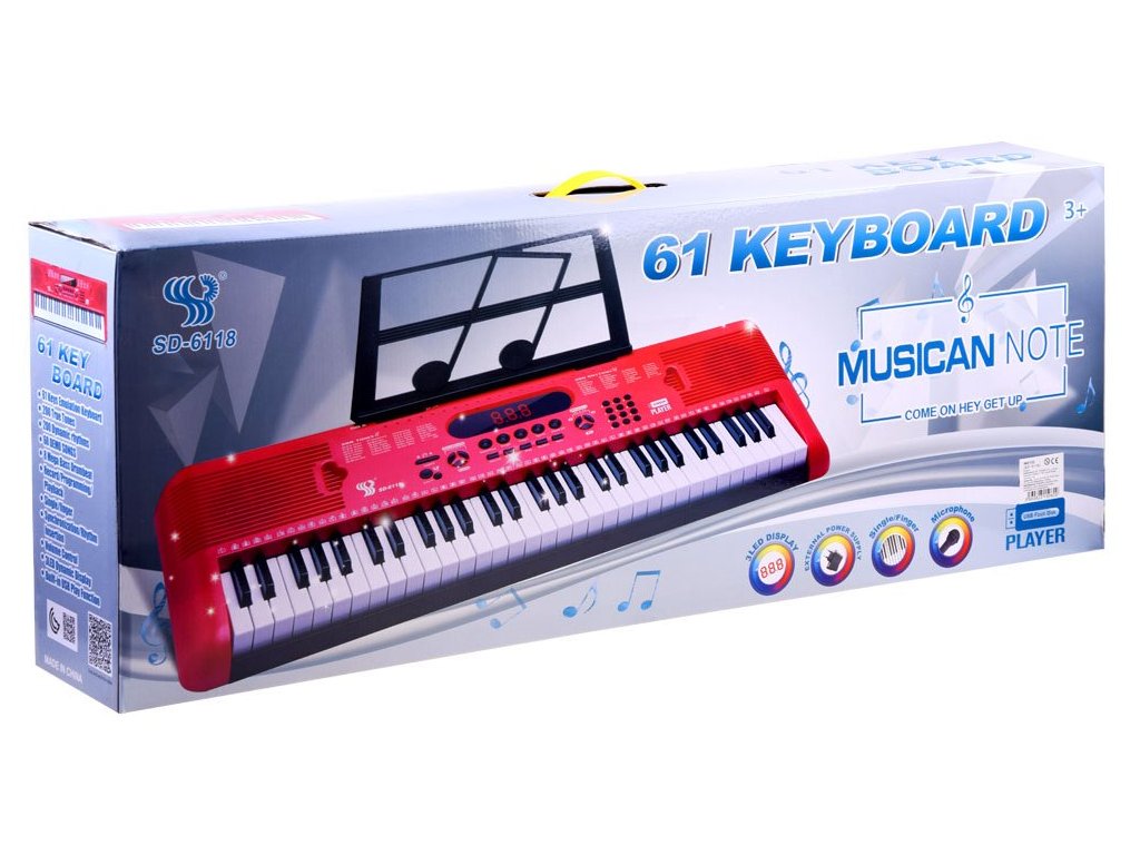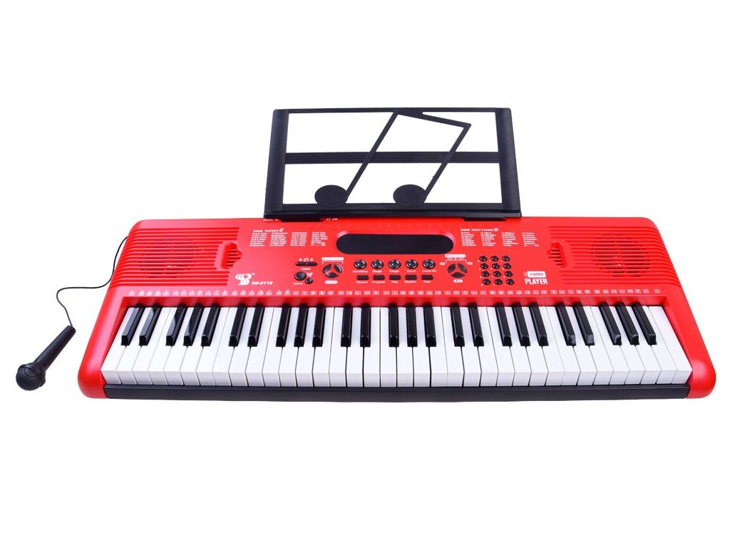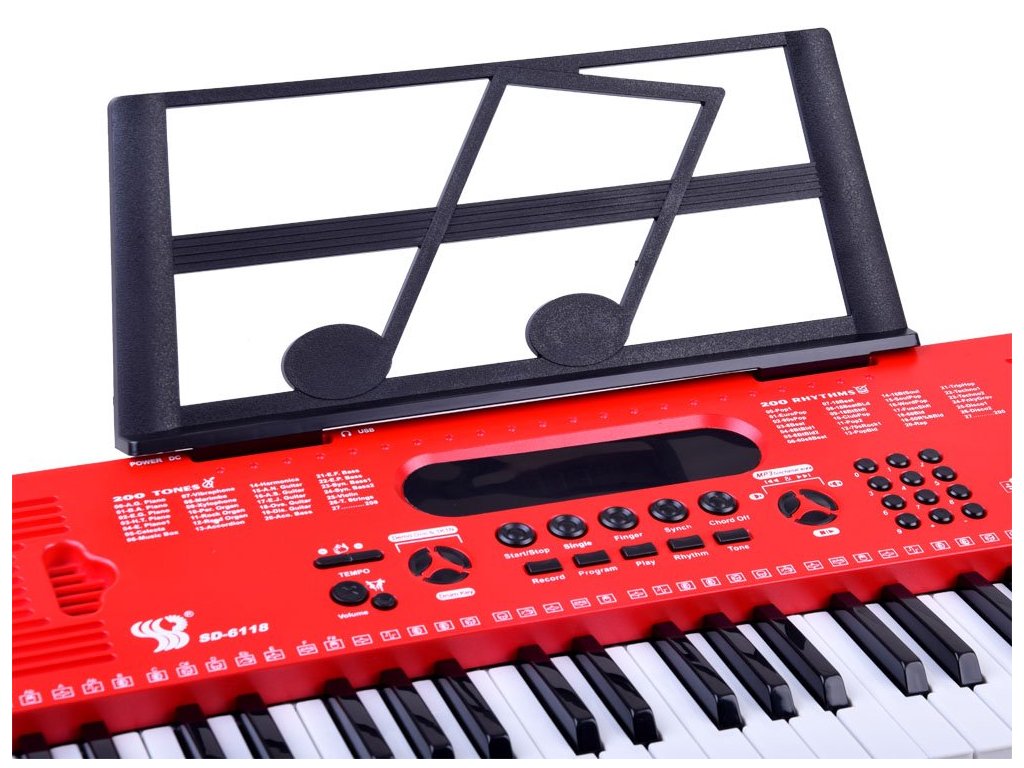 Červený klávesový nástroj SD-6118 s mikrofonem přináší mnoho úžasných funkcí a má velmi moderní vzhled. Klávesy jsou pečlivě zpracovány a mají nádhernou červenou barvu. Nástroj disponuje příjemným, čistým zvukem, 61 kláves je vhodných pro začínající hudebníky. Mikrofon umožňuje zpívat karaoke či vkládat vlastní skladby. Produkt obsahuje USB vstup pro MP3.