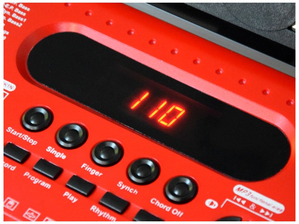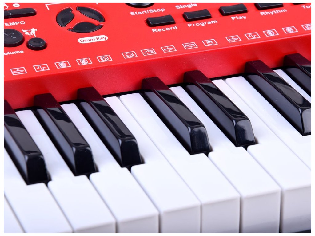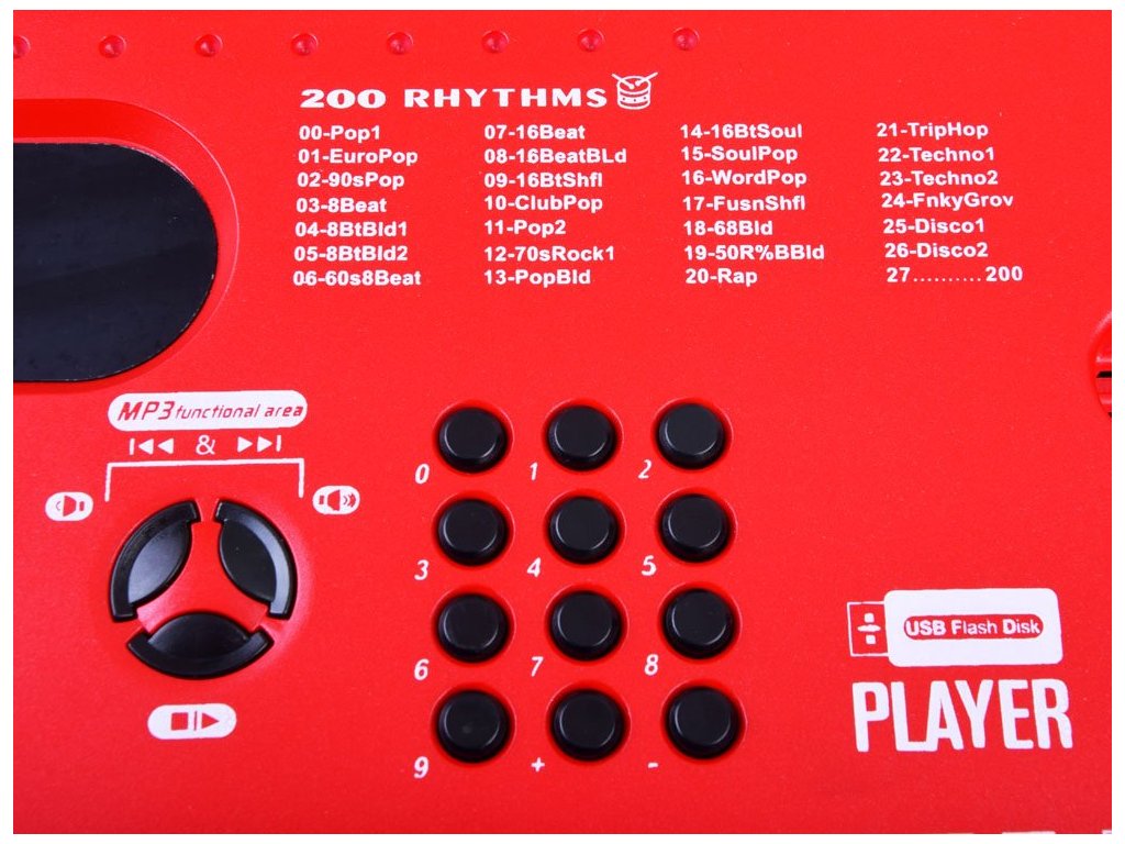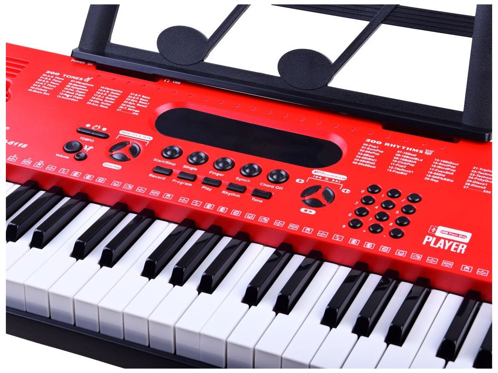 Červený klávesový nástroj SD-6118 s mikrofonem přináší mnoho úžasných funkcí a má velmi moderní vzhled. Klávesy jsou pečlivě zpracovány a mají nádhernou červenou barvu. Nástroj disponuje příjemným, čistým zvukem, 61 kláves je vhodných pro začínající hudebníky. Mikrofon umožňuje zpívat karaoke či vkládat vlastní skladby. Produkt obsahuje USB vstup pro MP3.