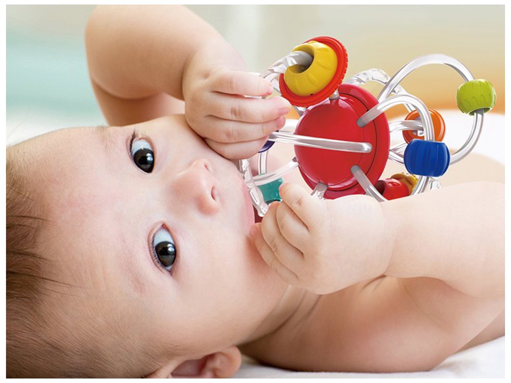 Kousátko má zvláštní využití, když miminko potřebuje masírovat svá bolavá dáseň. Díky rozmanitým výstupkům na orbitách a silikonovým trubicím si dítě může uklidnit svá podrážděná, bolavá dáseň žvýkáním různých částí hračky. Kousátko povzbuzuje k hrám díky barevným orbitám, otáčející se planetě a snadno uchopitelným silikonovým trubicím. Díky pružným prvkům si dítě hravě udrží hračku v rukou. Barevné orbity umístěné na ohebných spirálách se snadno posouvají po hračce.