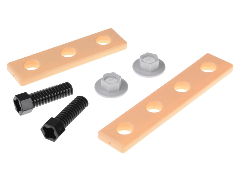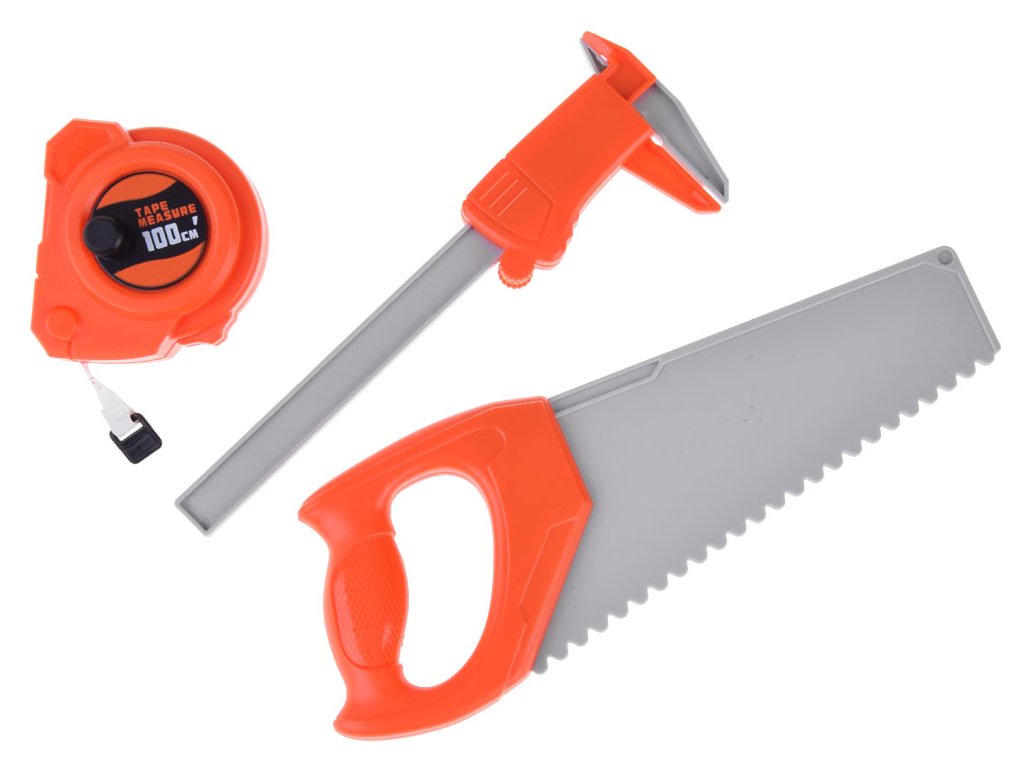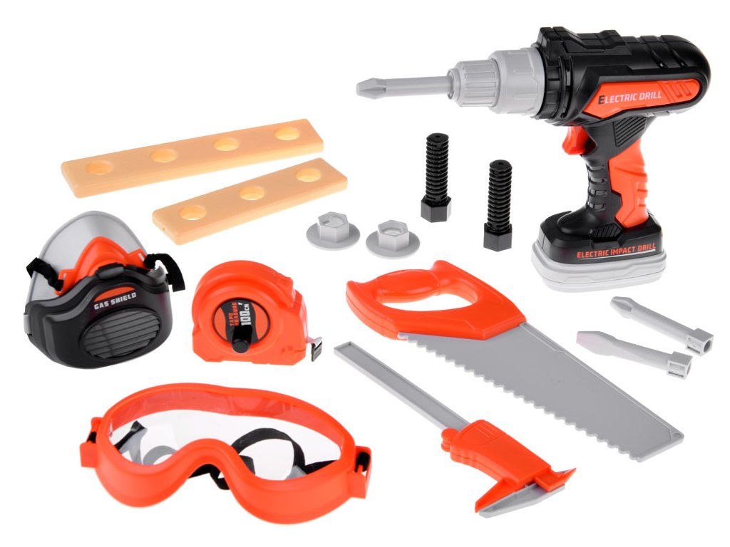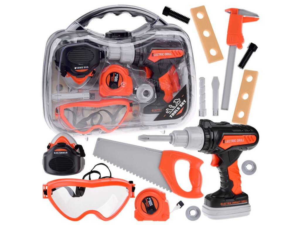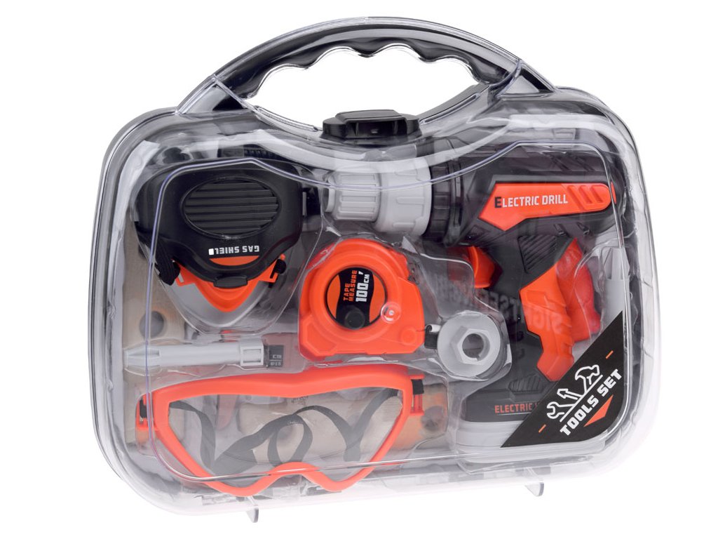 Kufřík s nezbytnými nástroji je ideální hračkou pro každého malého pomocníka ve vašem domě. Sada je vyrobena z kvalitního plastu v černé barvě s oranžovými detaily. Pohyblivá vrtačka funguje v obou směrech a s různými nástavci umožňuje snadné šroubování. S metrem mohou děti měřit vzdálenost a průměr, zatímco ochranné brýle chrání jejich oči.