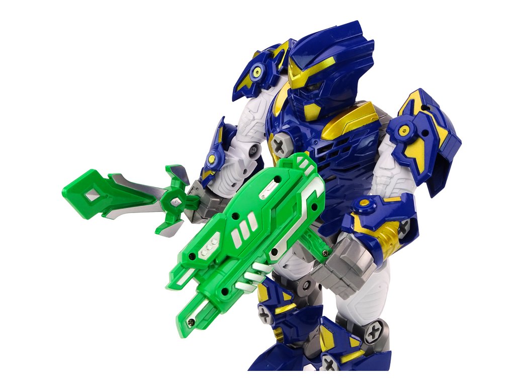 A robot egy zöld színű karddal és fegyverrel van felszerelve, ami egy fantázia-kaland elemet kölcsönöz a játéknak. A gyerek el tudja képzelni, ahogy a robot ellenségekkel harcol vagy különleges küldetéseket hajt végre, ami fejleszti kreativitását és mesemondó képességét.