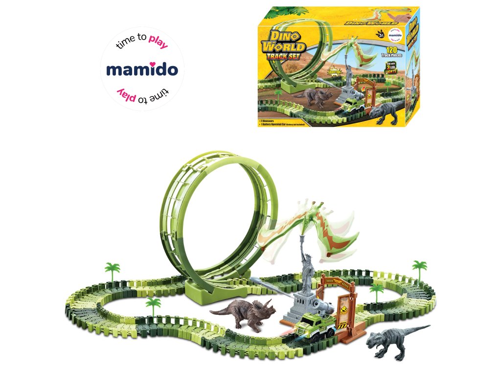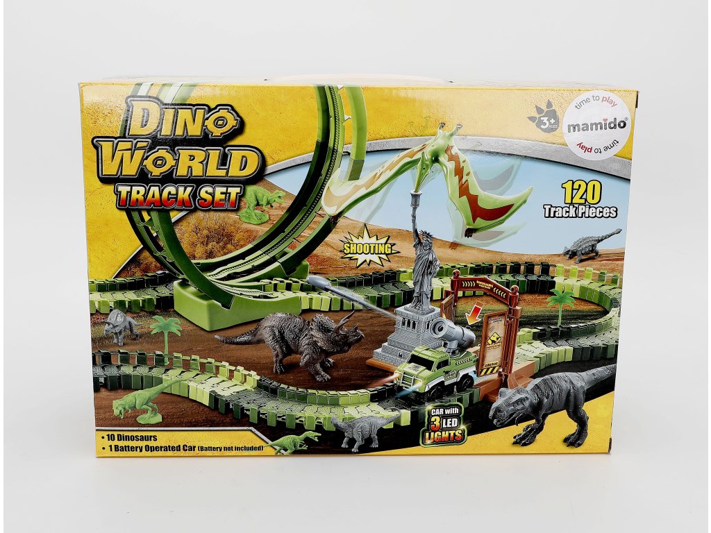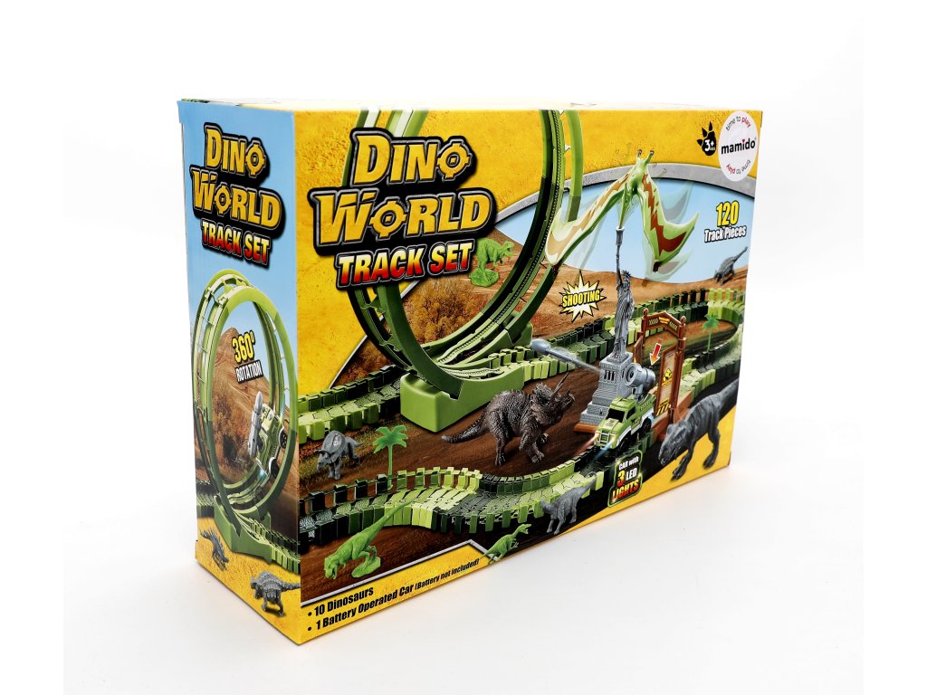 Kalandos dinoszaurusz pálya nagy 360°-os hurokkal, autóval és dinoszaurusz figurákkal. Csak össze kell rakni a rugalmas elemeket tetszőleges formába, be kell kapcsolni az autót, és kezdődhet a kaland. A pálya kaput, szobrot és kiegészítőket is tartalmaz, amelyek izgalmas játékszcénát hoznak létre.