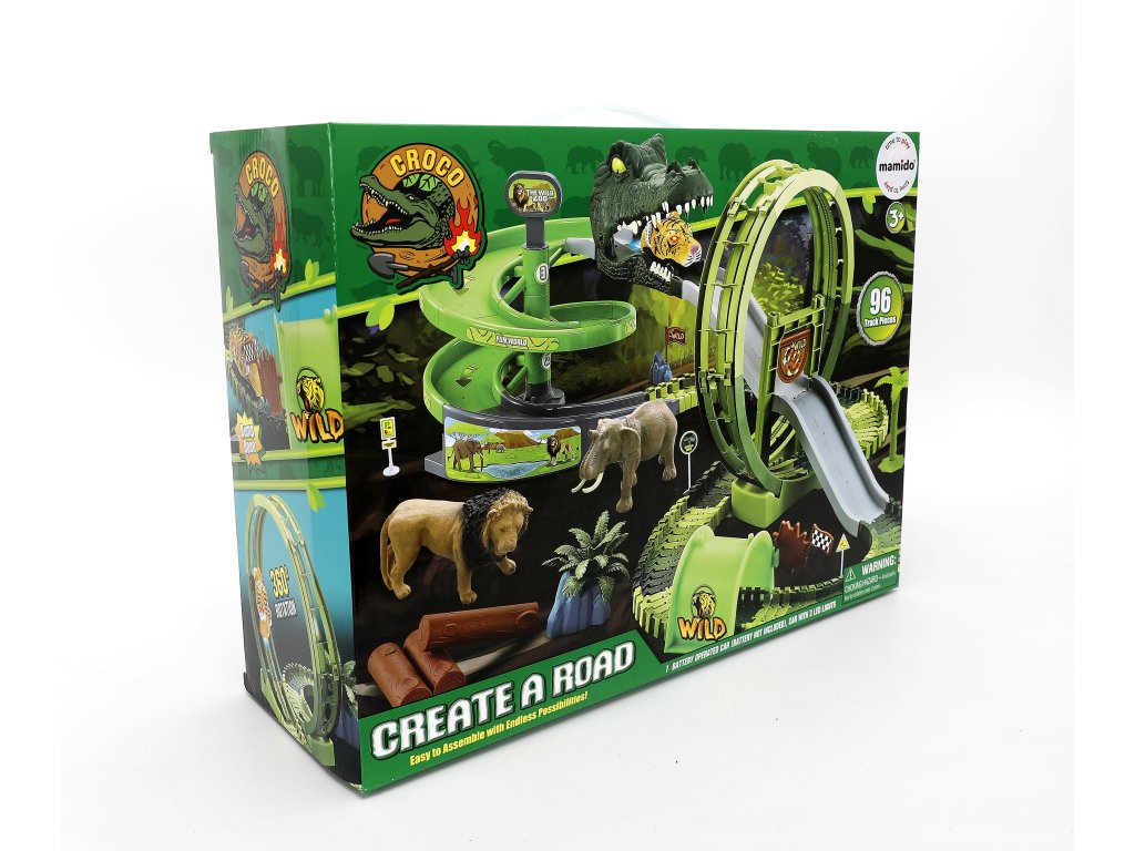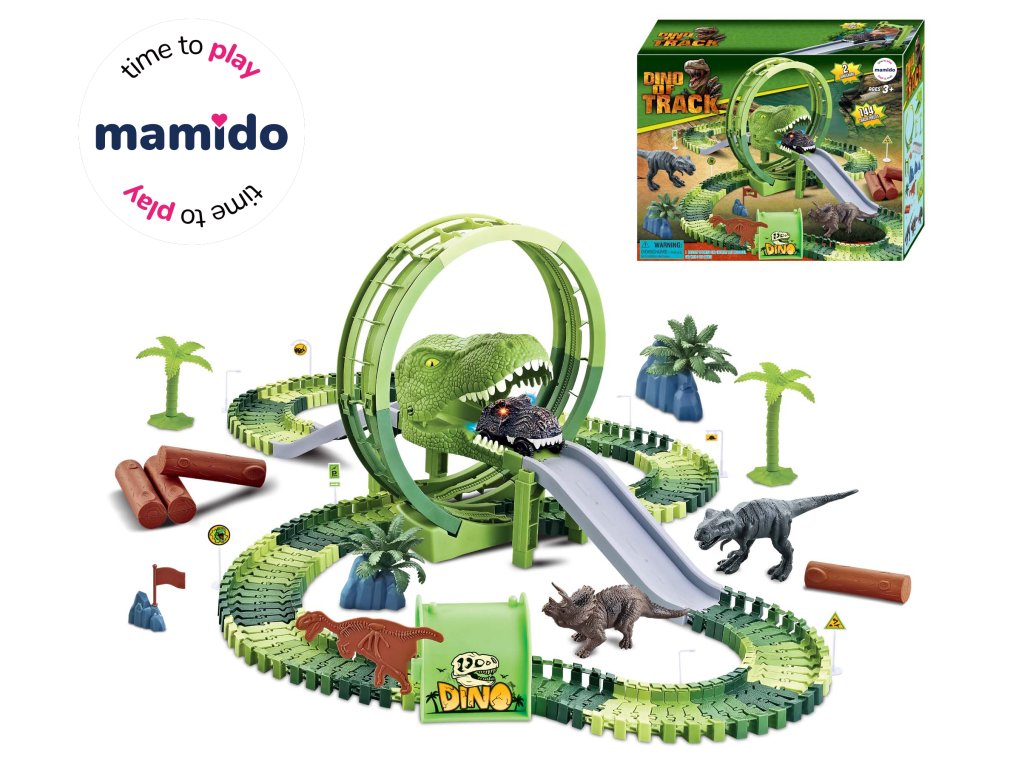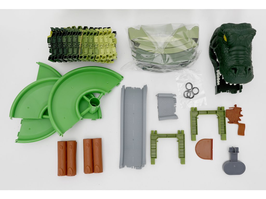 Kalandos kaland a őskori vadonban! A verseny off-road pálya nagy hurokkal és nyitható dinoszaurusz fejjel végtelen akciót és kreatív építést kínál a gyerekeknek. Felépítik a saját pályájukat, elhelyezik a pálmafákat, akadályokat, majd figyelik, ahogy az autó a ragadozó állkapcsán átrohan. A pálya rugalmas, variálható és tetszőlegesen átépíthető – egyenesek, kanyarok, rámpák, felhajtók és leereszkedés a dinoszaurusz szájába.
