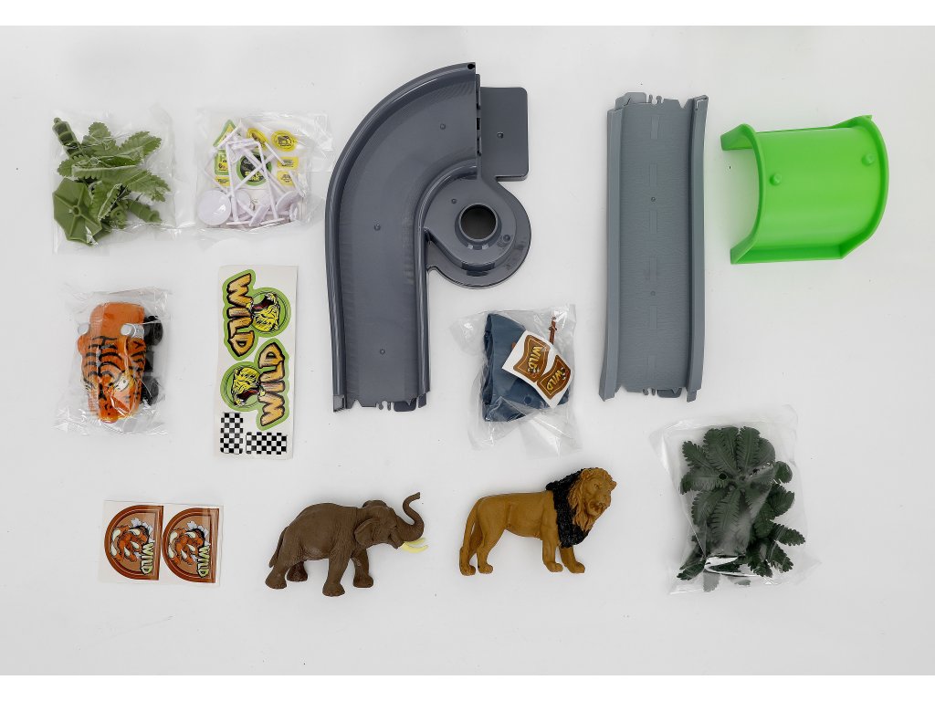 - Tartalma: kisautók, dinoszauruszok, híd, alagút, kapu, fák, kiegészítők