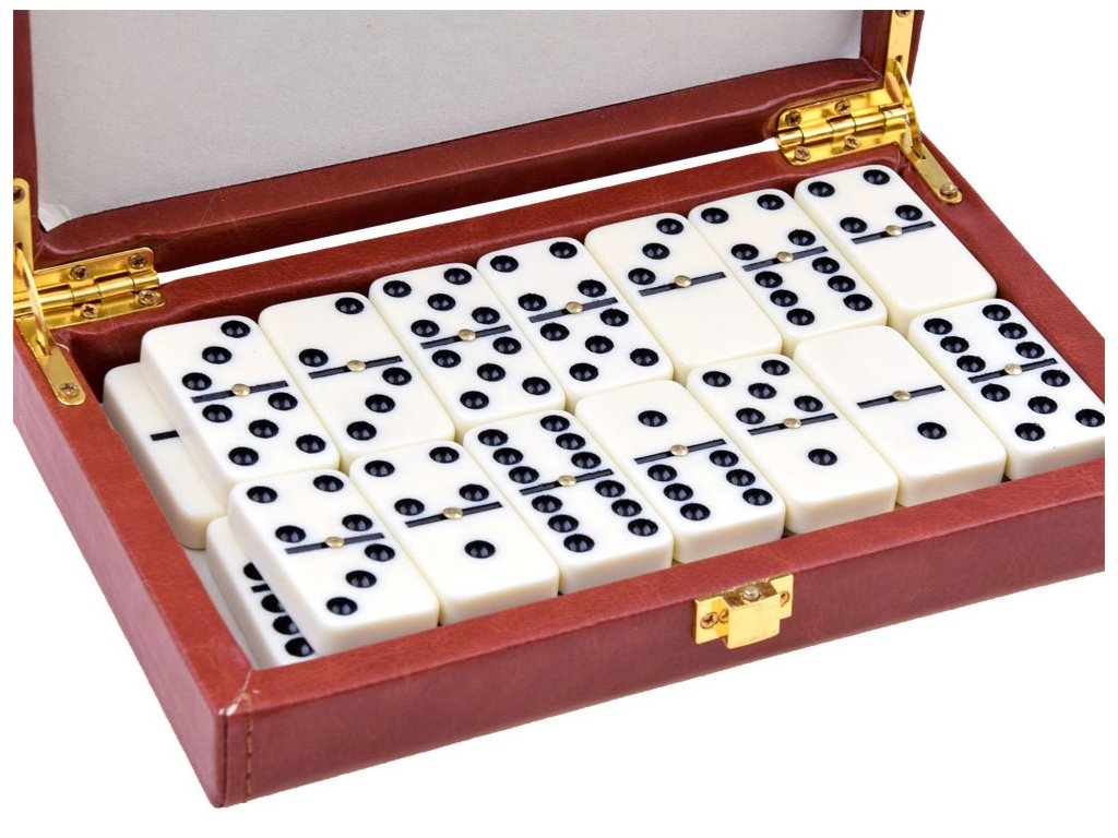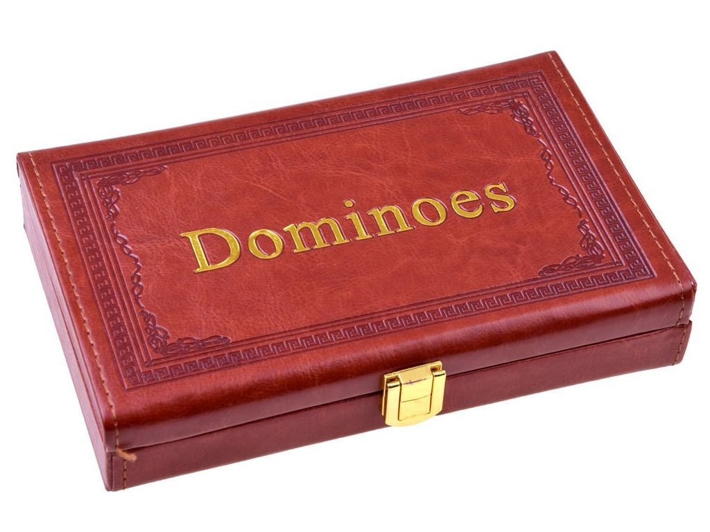 Sada je zabalená v elegantní velké krabici potažené ekokůží s nápisem Dominoes. Hra je ideální jako dárek.
