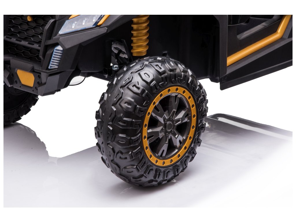 Gyermek elektromos autó Buggy UTV négy nagy teljesítményű 200 W-os villanymotorral. A játékautó könnyedén megbirkózik bármilyen terepen. Még két gyerek is kényelmesen ülhet az ülésben, mivel a játékautó akár 60 kg- os teherbírással is büszkélkedhet.
