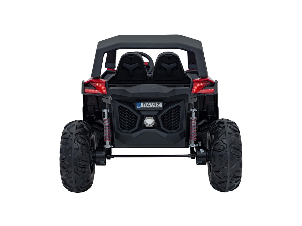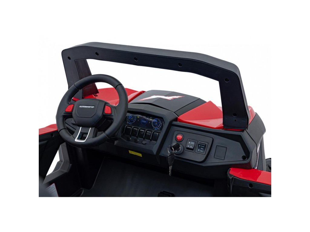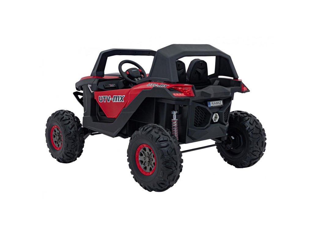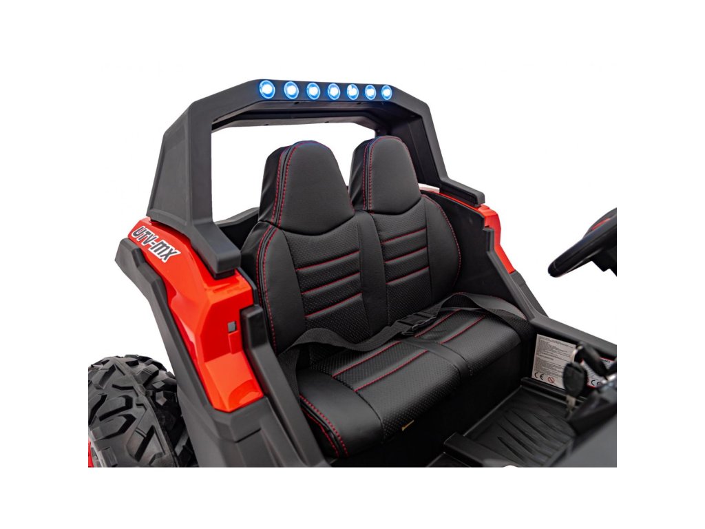 A Buggy UTV-MX 2000N gyerekjáték-autó puha EVA hab kerekeken érkezik, amelyek csendesek és alkalmazkodnak a különböző terepviszonyokhoz. A gyermek egy kényelmes, öko-bőrből készült ülésben ül, a biztonságát pedig biztonsági övek biztosítják.