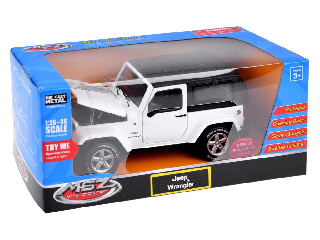 A Jeep Wranglert terepvezetésre tervezték, és a Jeep márka gyönyörű klasszikusát képviseli. A játékautó hang- és fényeffektusokkal, nyitható ajtókkal és motorháztetővel van felszerelve. A Friction Power mechanizmussal mozog, ami azt jelenti, hogy sima felületen mozog a játék hátralökésével.