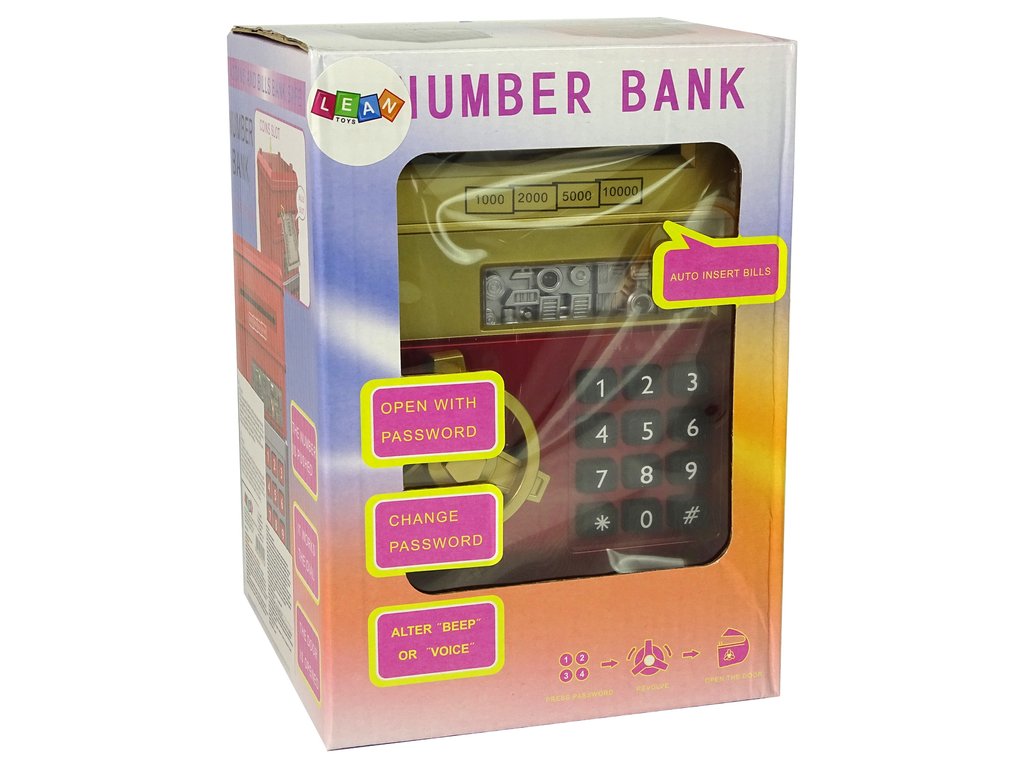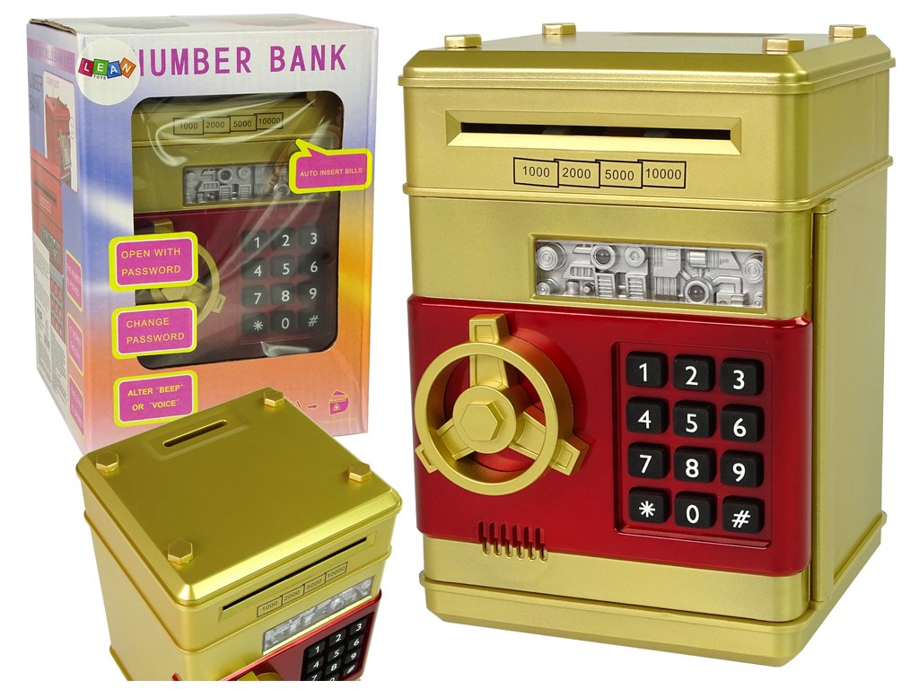 Celé je vyrobeno z plastu, což je bezpečné pro malé děti. Sejf má zlatě-červenou barvu. Dokonale zapadne do dětského pokoje.