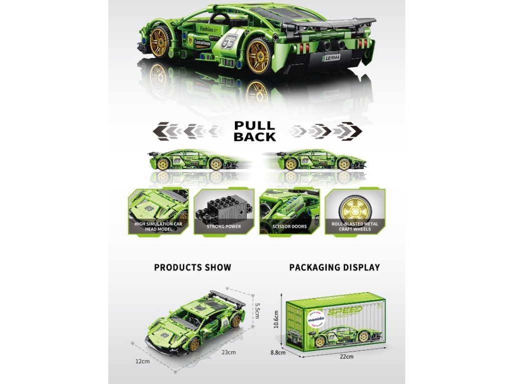 Az autó összeállítása szórakoztató, és fejleszti a logikai gondolkodást, a türelmet és a térbeli képzelőerőt. Az elkészült modell sportos kialakításával, aerodinamikus formáival és mozgatható kerekeivel tűnik ki. A csomag építőkockákat, útmutatót és matricákat tartalmaz a megjelenés finomításához.