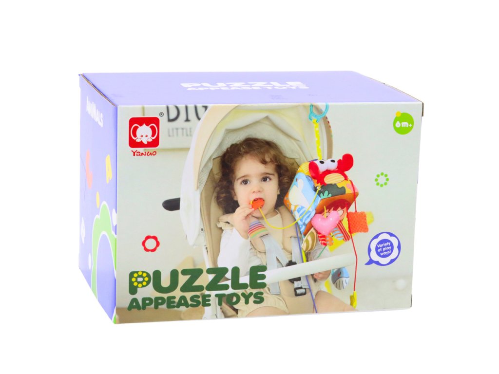 A kockára erősített medálok más-más funkciót töltenek be – mindegyik más-más érzékszervi textúrával rendelkezik, egyesek suhognak, mások zörögnek, a többit pedig húzni és szorítani lehet. Minden elem ösztönzi a gyermeket az önálló interakcióra és felfedezésre.