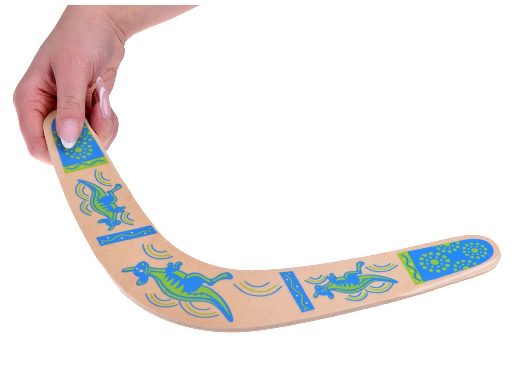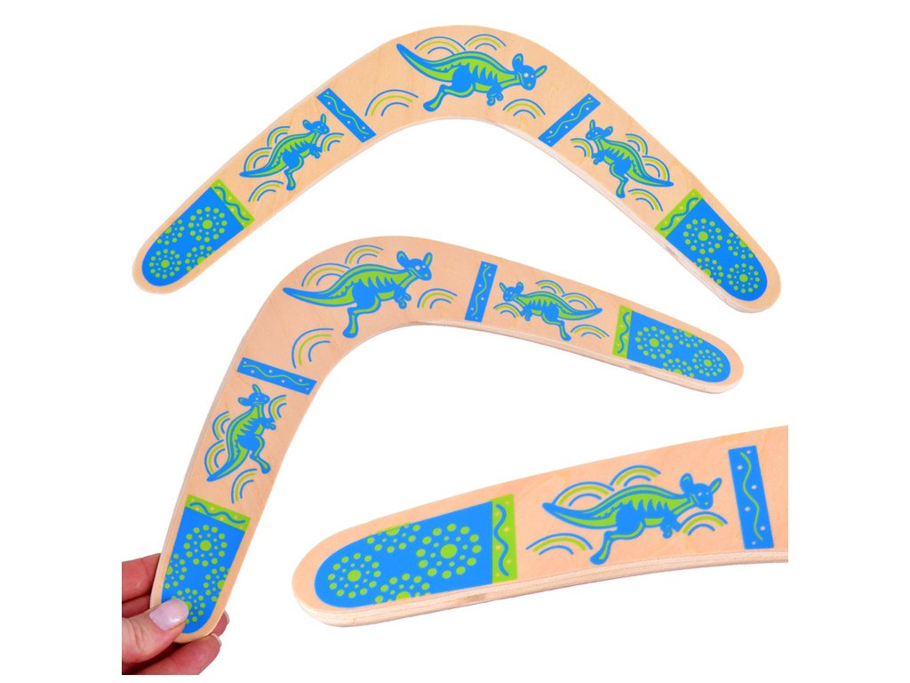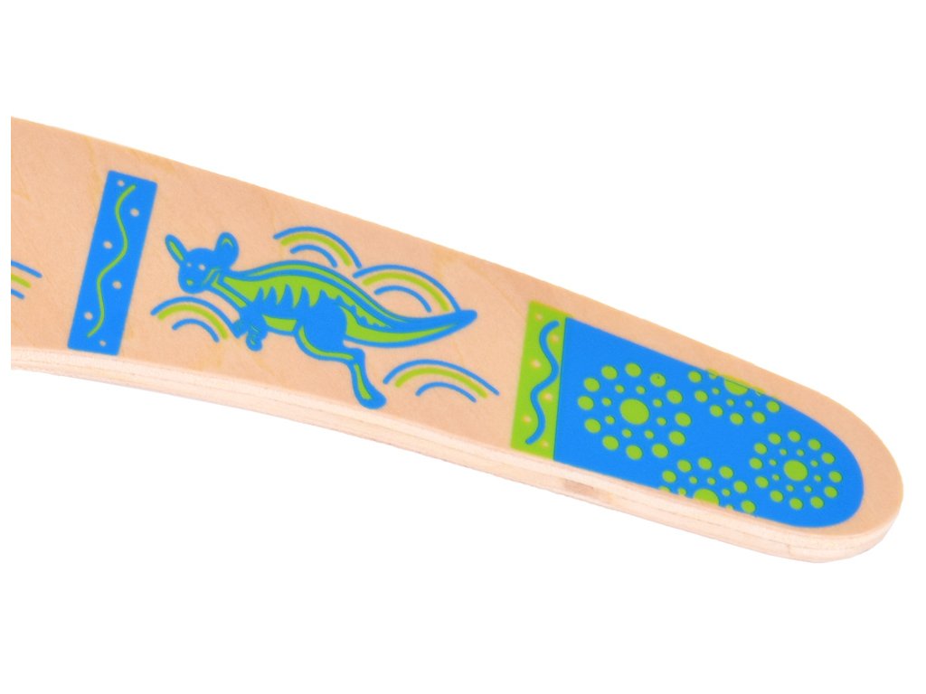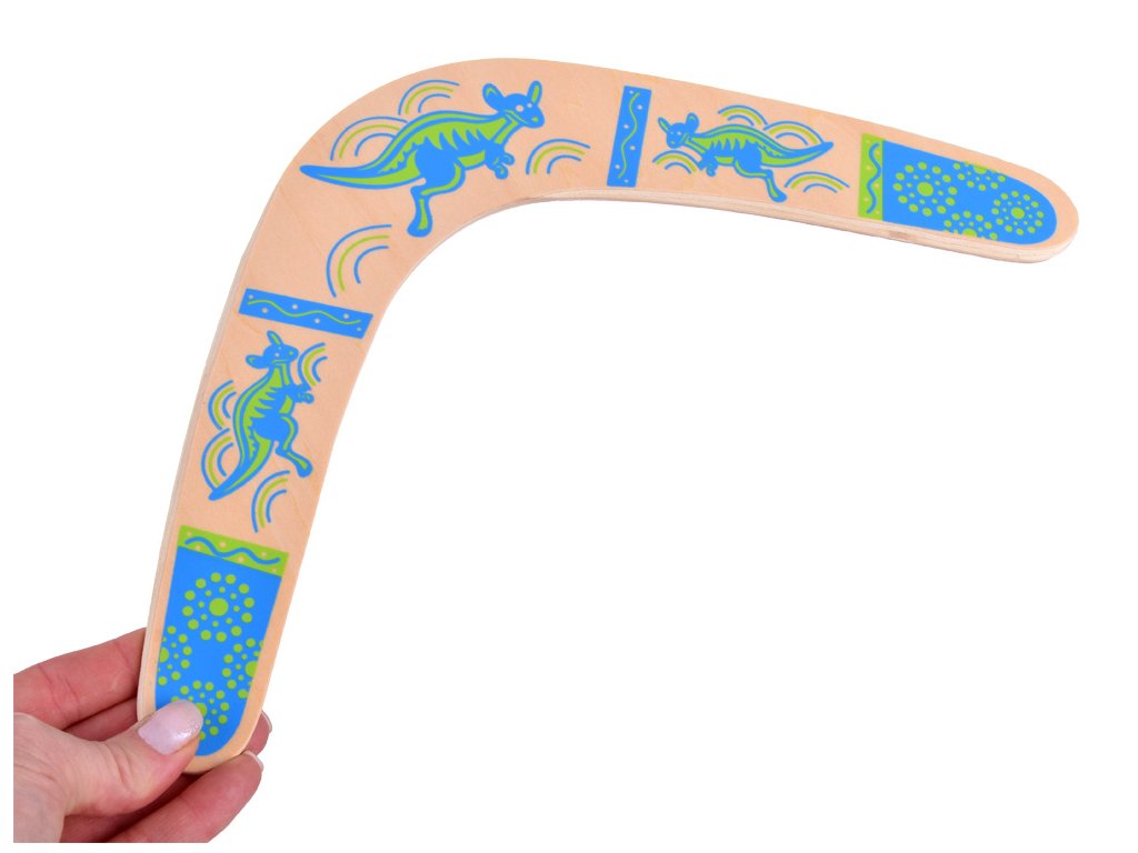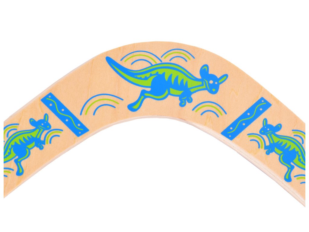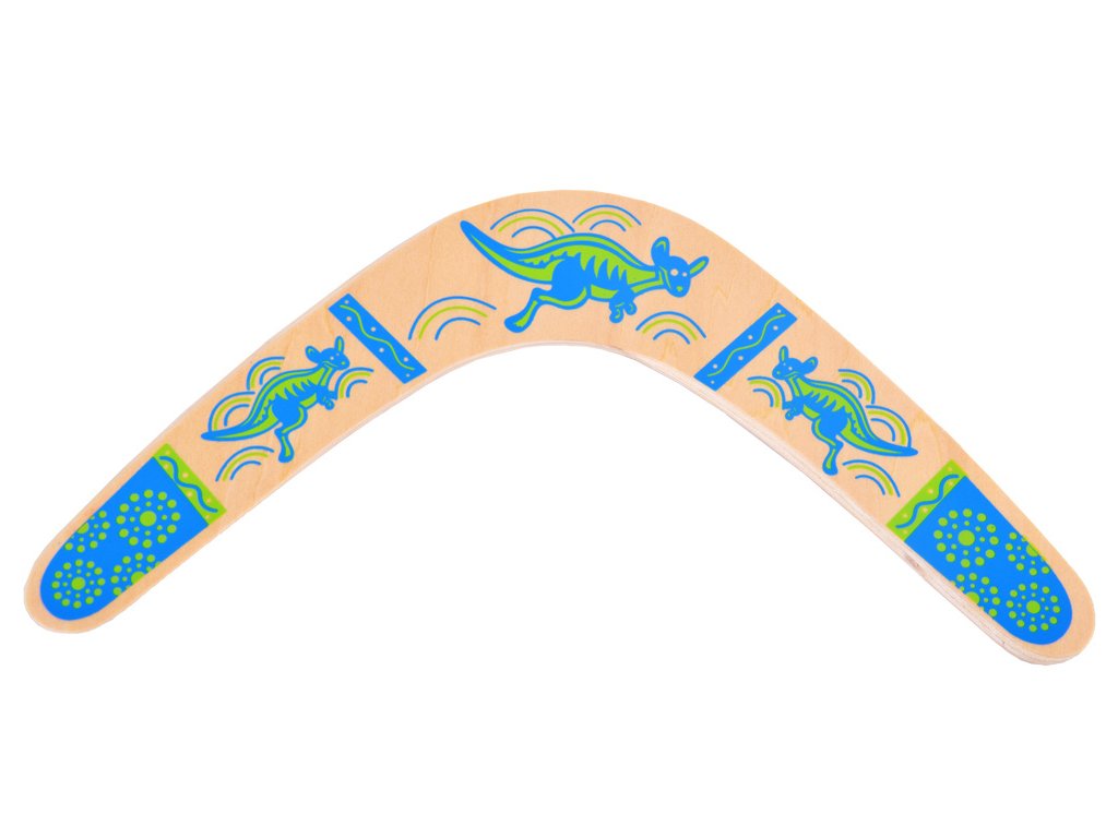Bumerang má charakteristický tvar připomínající písmeno "V". Je vyroben z lehkého, ale odolného dřeva. Je zdoben barevnými vzory a obrázky skákajícího klokana, což mu dodává vizuální přitažlivost.