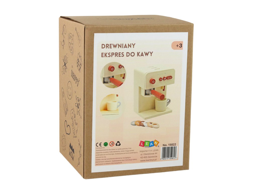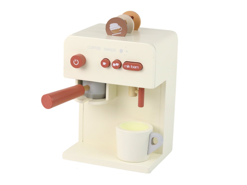 Ez a fából készült kávéfőző egy valódi gép hű utánzata, amely lehetővé teszi a gyermekek számára, hogy megtapasztalják a barista élményt. Az olyan részletek, mint a barna gombok, biztosítják a hitelességet.