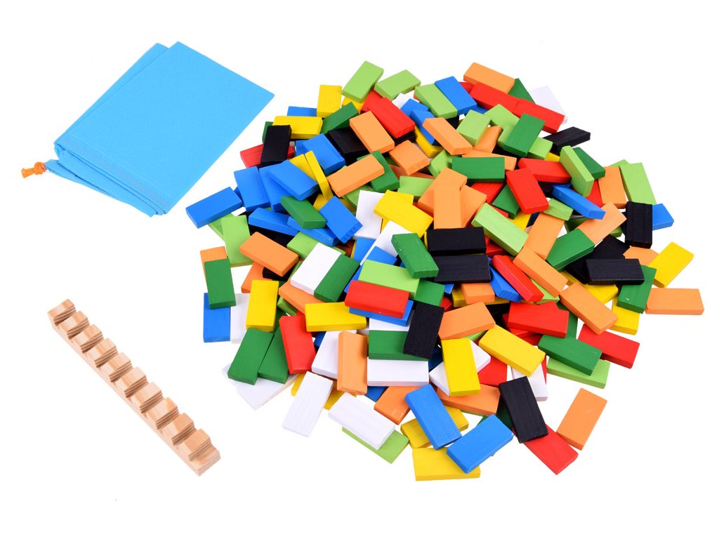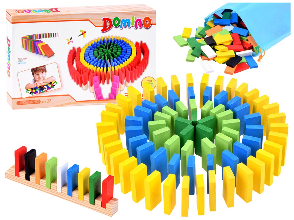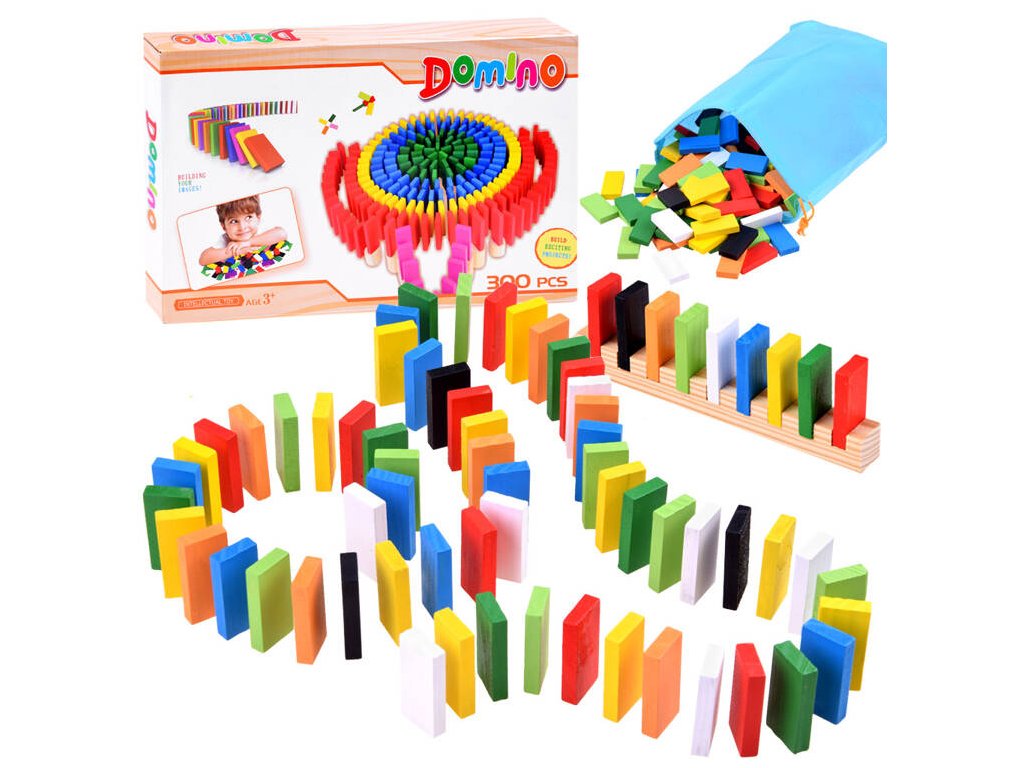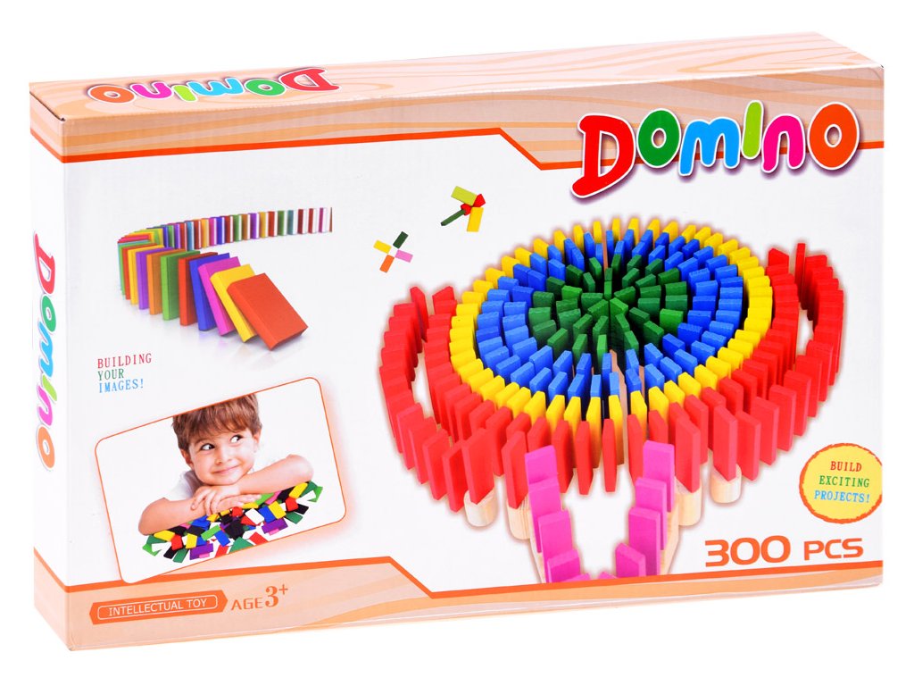 Barevné, dřevěné kostky DOMINO zajistí spoustu skvěle stráveného času. Sada obsahuje 300 prvků, ze kterých může dítě skládat různé kombinace, stavby atd. S touto sadou je možné vytvořit efektní tratě, které se rozsypou po převrácení jedné kostky a vytvoří kaskádu padajících prvků před sebou. Dítě může z barevných obdélníkových kostek stavět fantastické konstrukce a tratě. Skvělá sada nabízí mnoho možností hry a učení.