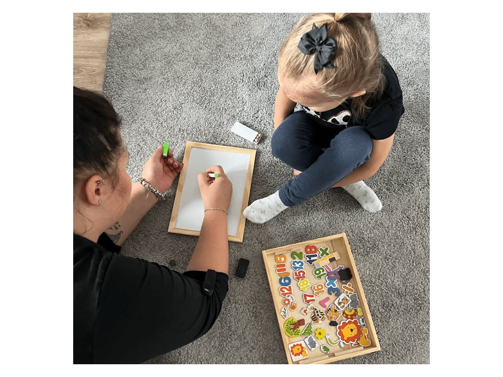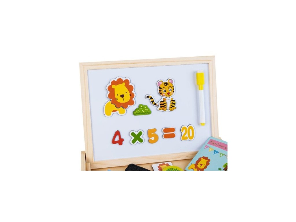 Dřevěná magnetická a křídová tabule s příslušenstvím bude fungovat při uměleckých pracích, naučí dítě psát, počítat matematické úlohy, vytvářet kreativní kresby a obrazy. Na křídové straně můžete kreslit křídou a na magnetické straně můžete malovat, psát suchým perem, lepit obrázky a magnetická čísla.