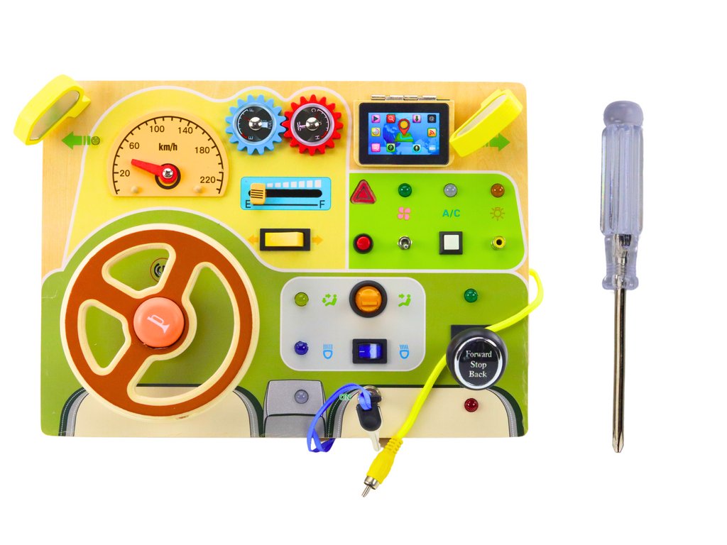 Az érzékelő panel számos elemmel van felszerelve, mint például gombok, kezelőszervek, csúszkák és színes LED lámpák, amelyek különböző színekben ragyognak, és felkeltik a kicsik figyelmét. Ezen interaktív elemek mindegyike utánozza az autókban található tényleges funkciókat, így a játék rendkívül valósághű és vonzó.