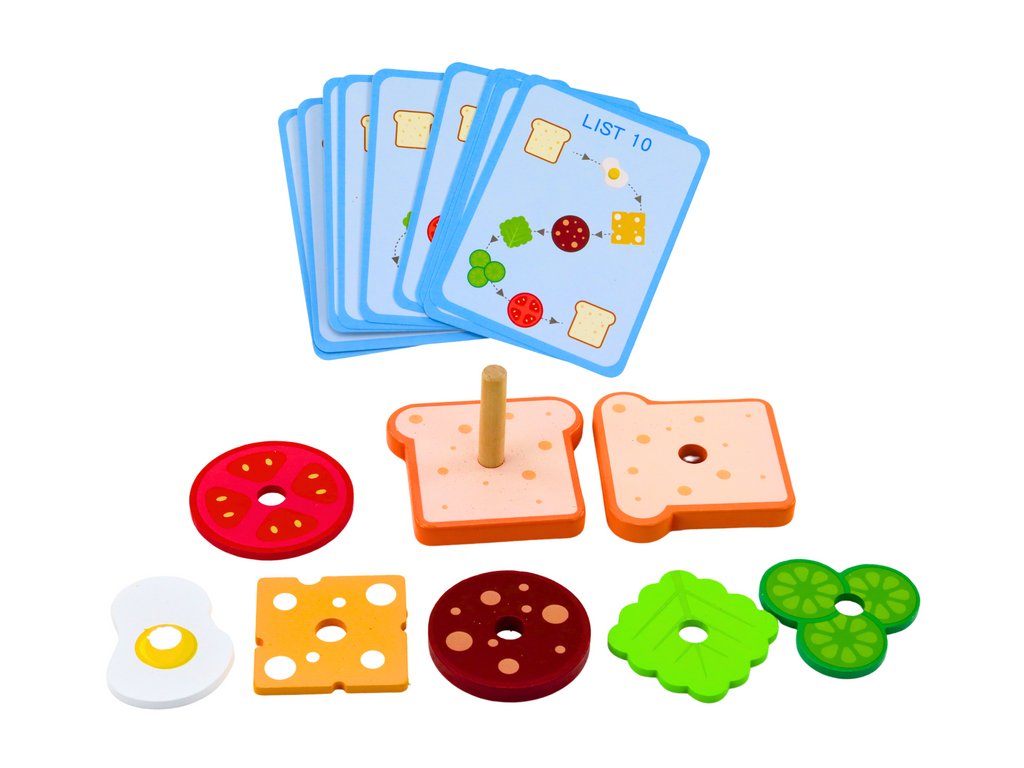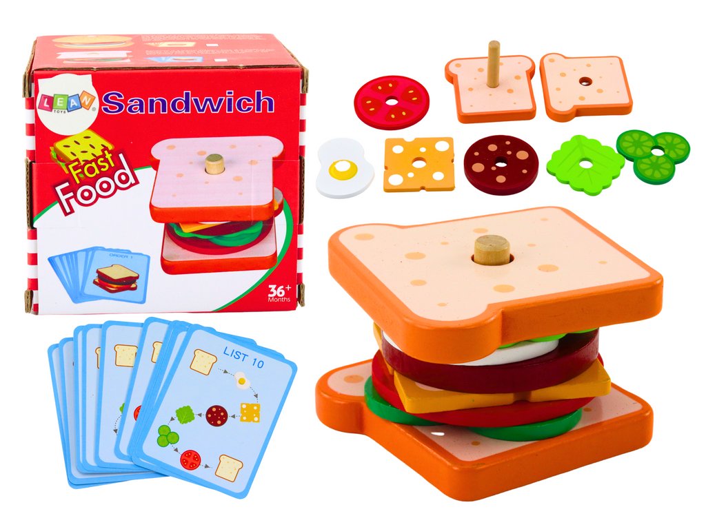 A fából készült szendvics 8 darabból áll, és egy nagyszerű oktatójáték, amely szórakoztató és kreatív fejlődést kínál a gyerekeknek. A készlet különféle összetevőket tartalmaz, például szeleteket, sajtokat vagy zöldségeket, amelyeket tetszés szerint kombinálva saját hamburgert készíthetsz. Tartalmaz továbbá 10 receptkártyát is, amelyeket a gyerekek követve fejleszthetik étkezési tervezési és elkészítési készségeiket. A játék ezzel a készlettel ösztönzi a koordinációt, a kreativitást és a színek és formák tanulását, míg a faelemek hosszú élettartamot és biztonságot nyújtanak.