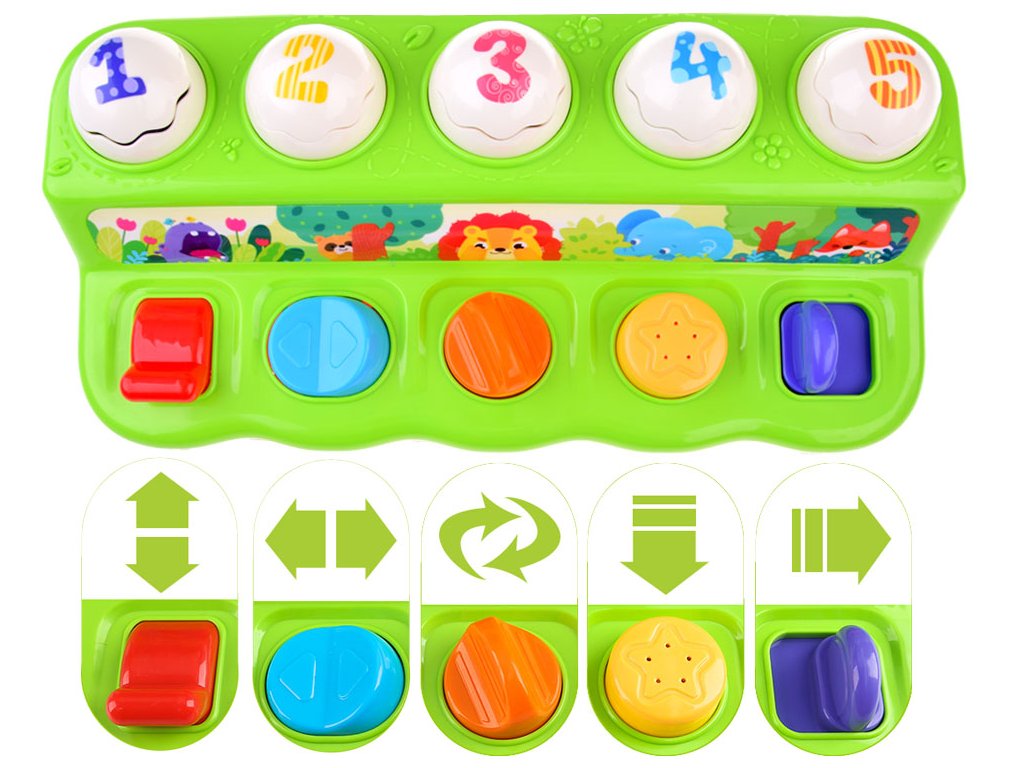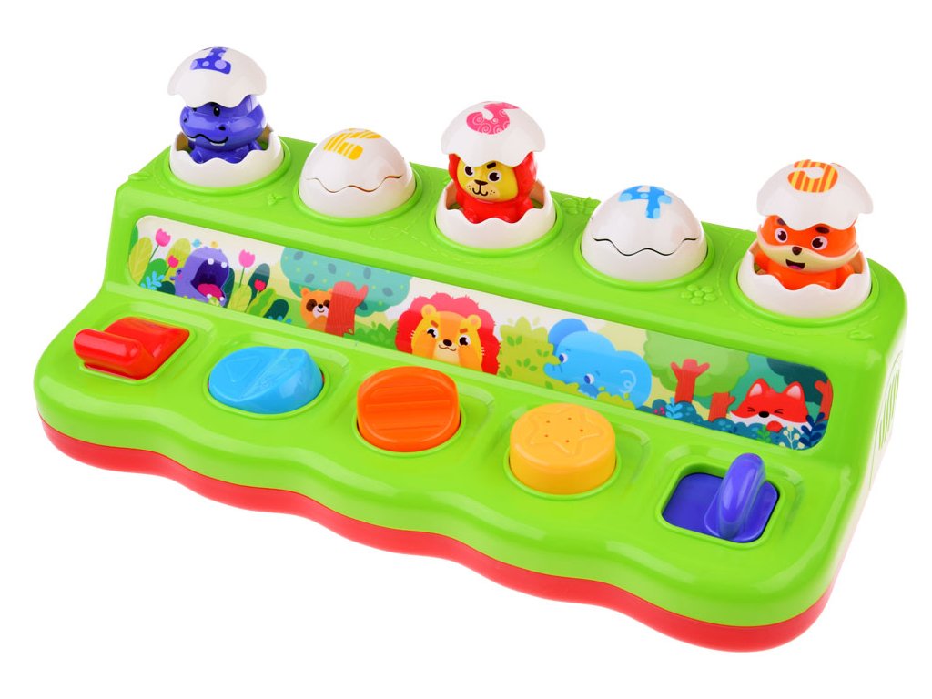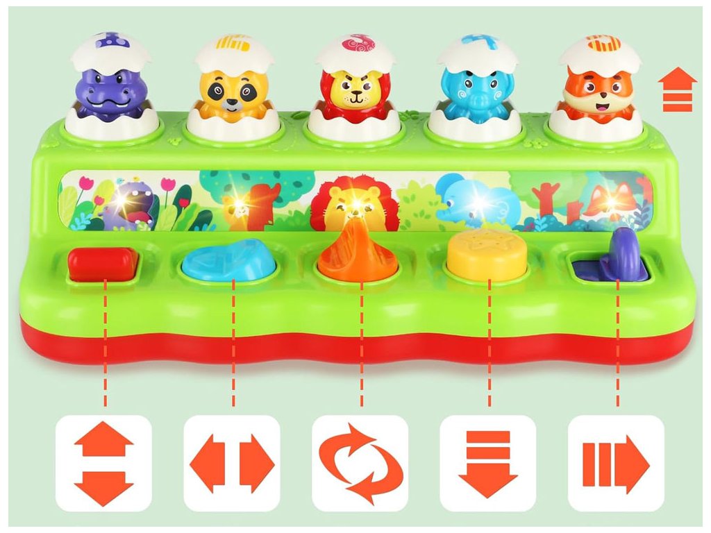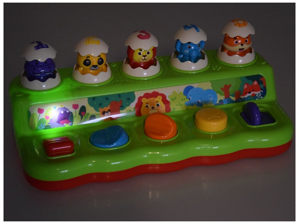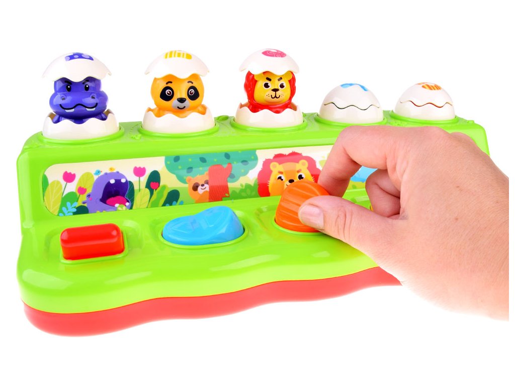 Učí dítě používat tlačítka, otočné knoflíky, stisknutí a tahání. Když je joystick, přepínač, knoflík nebo tlačítko před nimi stisknuto, zvířátko vyskakuje z vajíčka.