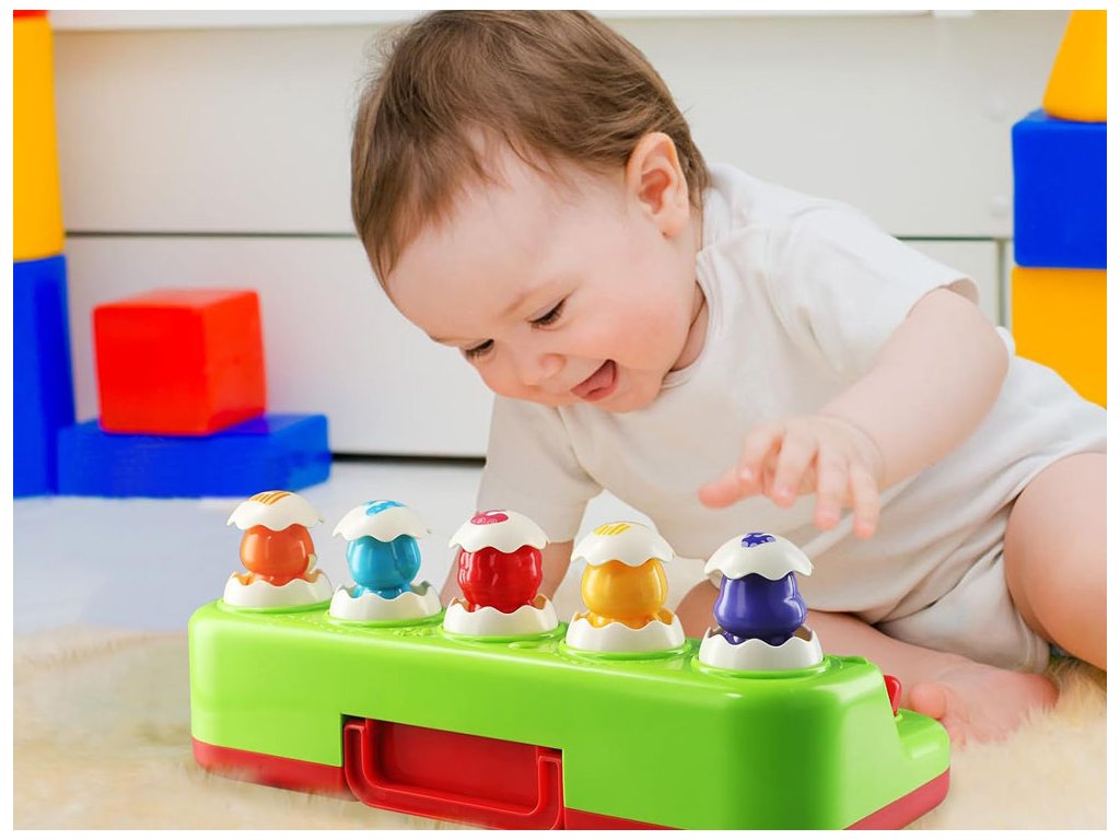 Hračka je vhodná pro rozvoj motorických dovedností a učení příčinnosti, zvyšuje pružnost prstů a rukou. Veselá, interaktivní hračka pro cvičení dětských ručiček. Hračka s vyskakujícími zvířátky je velmi atraktivně zpracována - v zelené grafice se roztomilými, malými zvířátky, která se skrývají ve svých skořápkách.