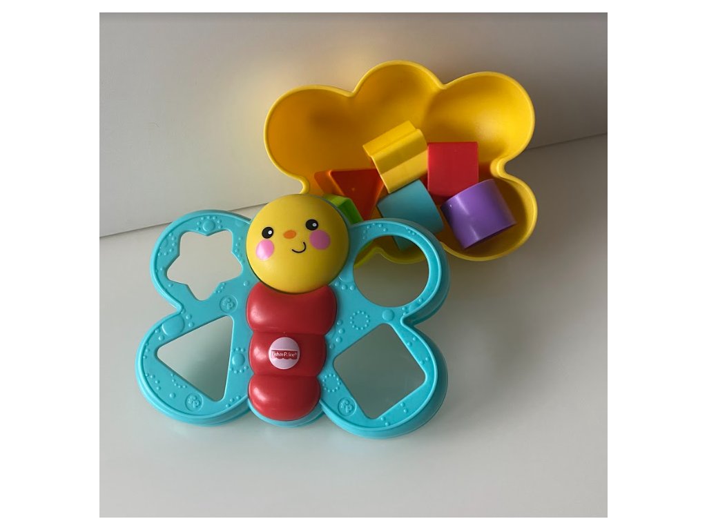 Motýlek Fisher-Price učí děti rozpoznávat tvary a barvy. Odnímatelné víko umožňuje dítěti samo vkládat a vyjímat kostky.