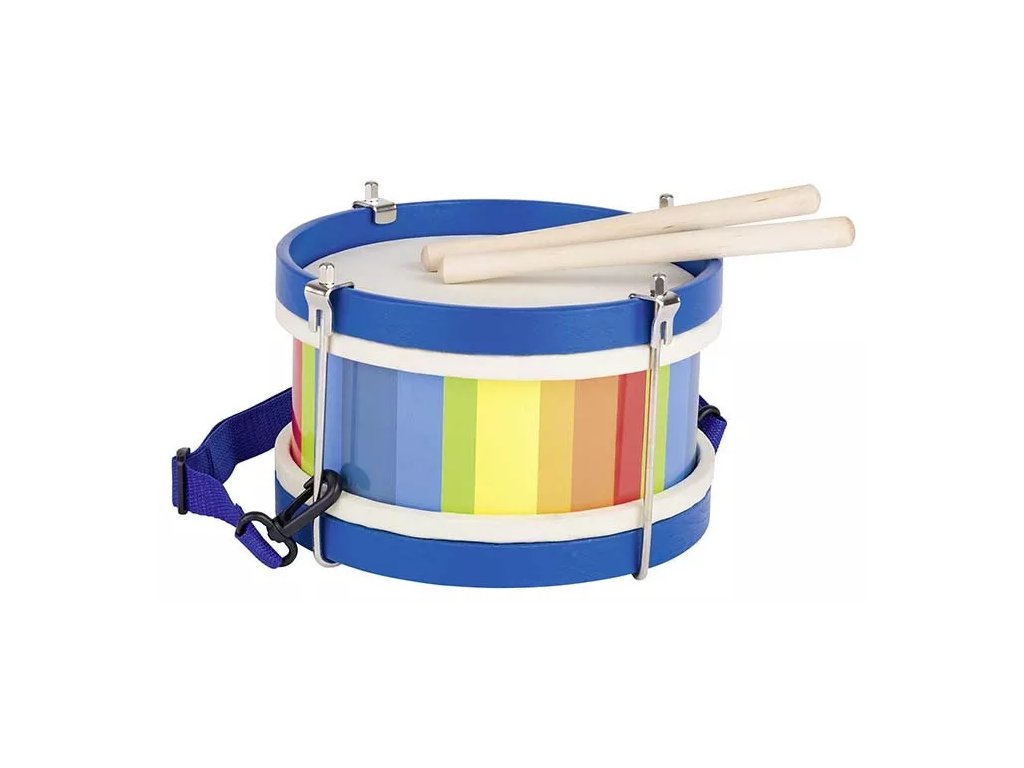 A színes, fából készült dob természetes fa ütőkkel és valódi bőr membránnal rendelkezik. A praktikus pántnak köszönhetően a gyerekek a vállukra akaszthatják a dobot.