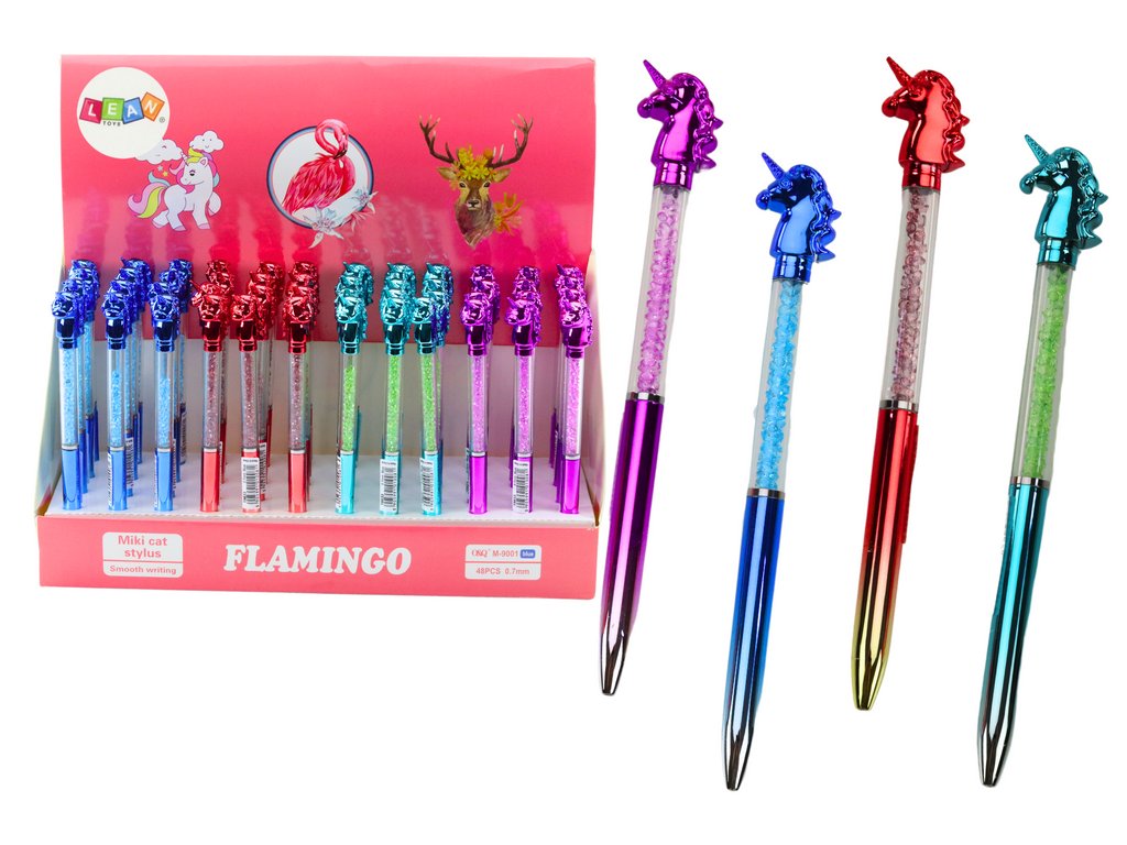 Ez az egyedülálló toll ötvözi az eleganciát és a funkcionalitást. A végén egyszarvú található, ami szemet gyönyörködtető megjelenést kölcsönöz neki. A kék tinta ideális társ a mindennapi használatra és különleges alkalmakra is. Kiváló választás azok számára, akik bájt szeretnének varázsolni jegyzeteikbe vagy levelezésükbe.