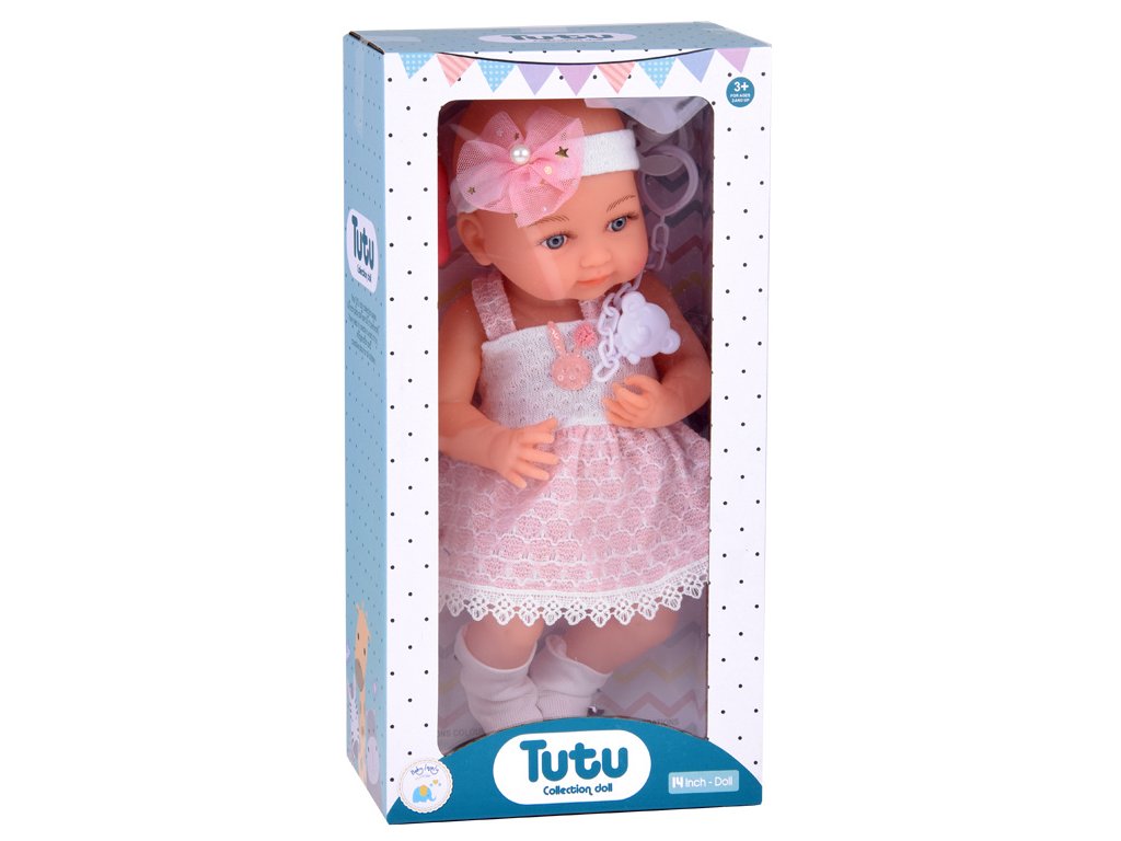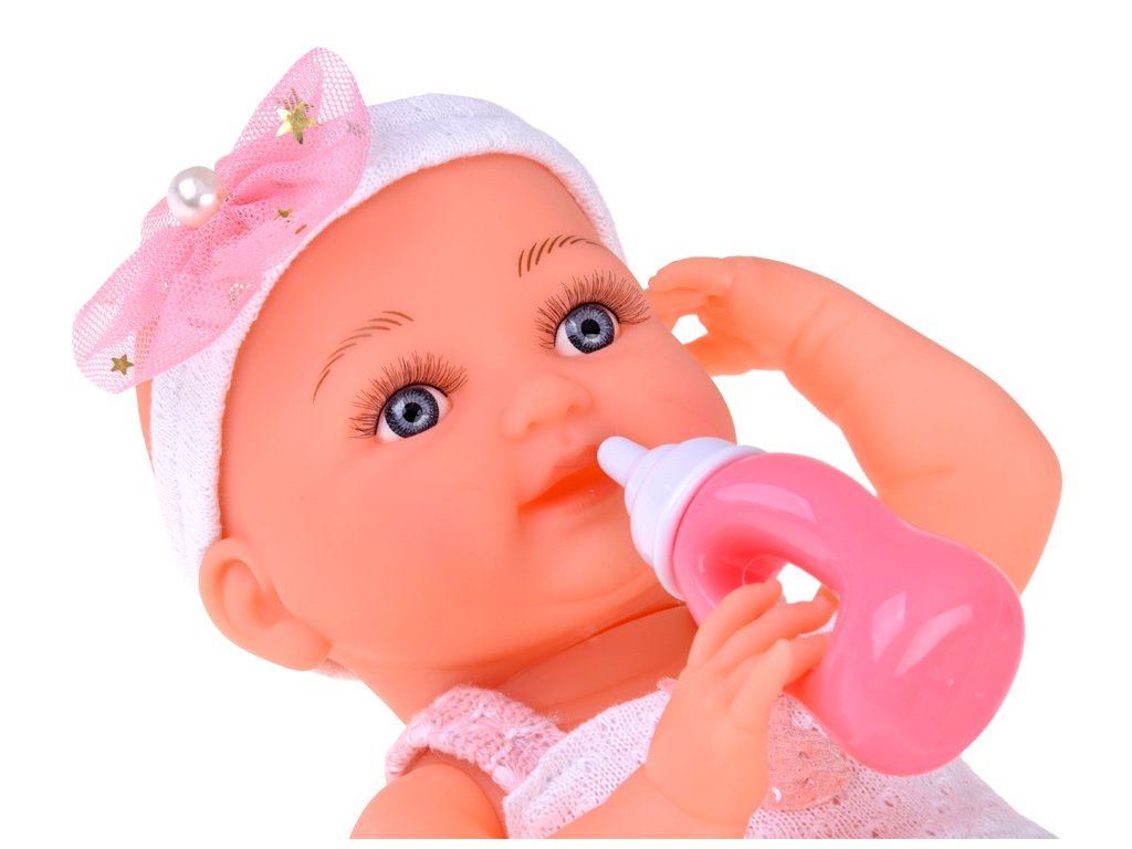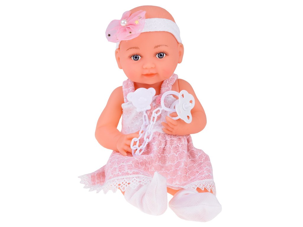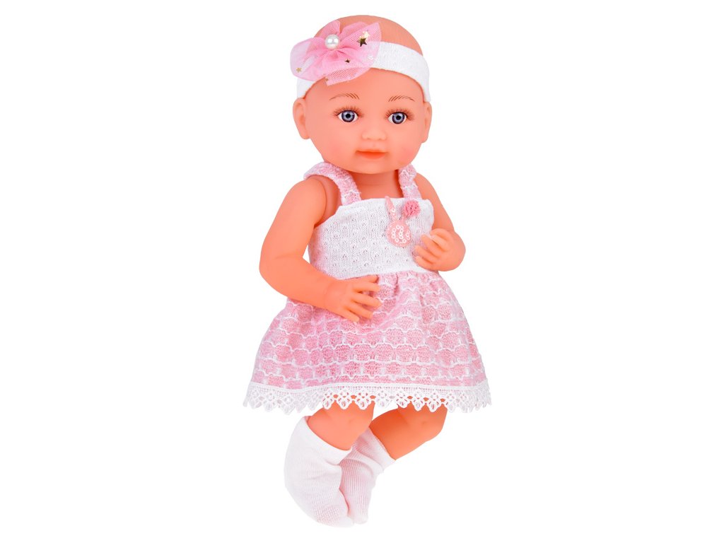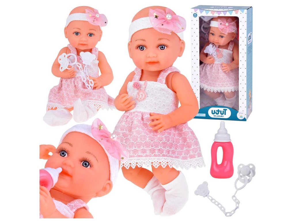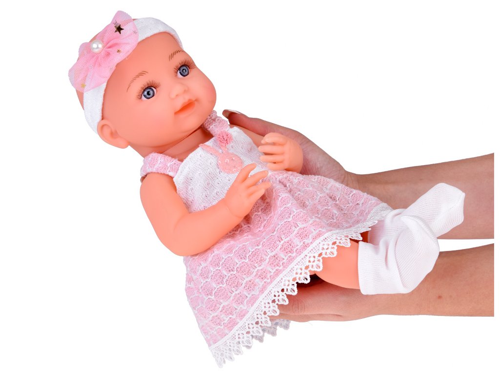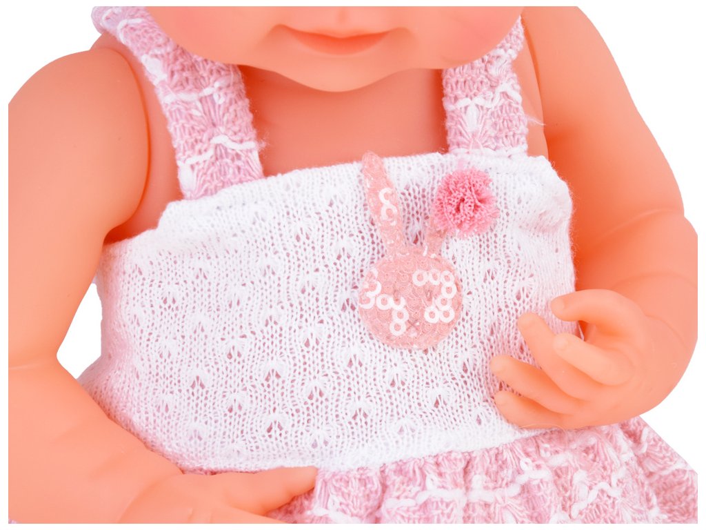 A nagy kék szemek, amelyeket hosszú, kiálló szempillák vesznek körül, vonzzák a figyelmet. A gyermek szeme nem csukódik le, és a baba barátságos arca játékra ösztönöz. A baba egy gyönyörű fehér és rózsaszín ruhába van öltözve, amelyet nyuszi díszített pomponokkal és csipkével. A babának nincs haja, de fejét tüll masnival és gyöngyökkel díszített fejpánt . Fehér zokni van a lábán.