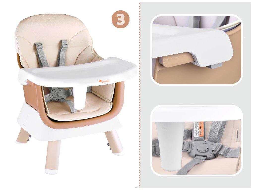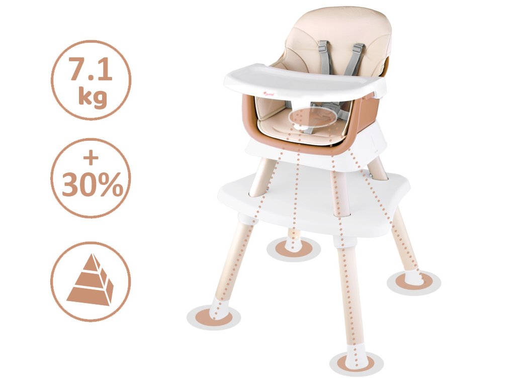 Jedná se o moderní kus nábytku, který se hodí do každého dětského pokoje, obývacího pokoje nebo kuchyně. Díky možnosti použití v různých variantách se bude hodit k jídelnímu stolu i do dětského koutku. Pohodlné, správně tvarované sedadlo má pětibodové bezpečnostní pásy, pojistku proti sklouznutí ze židle. Čalounění použité na židli je prodyšné a vyrobené ze snadno čistitelného materiálu, což je důležité pro udržení čistoty nábytku.