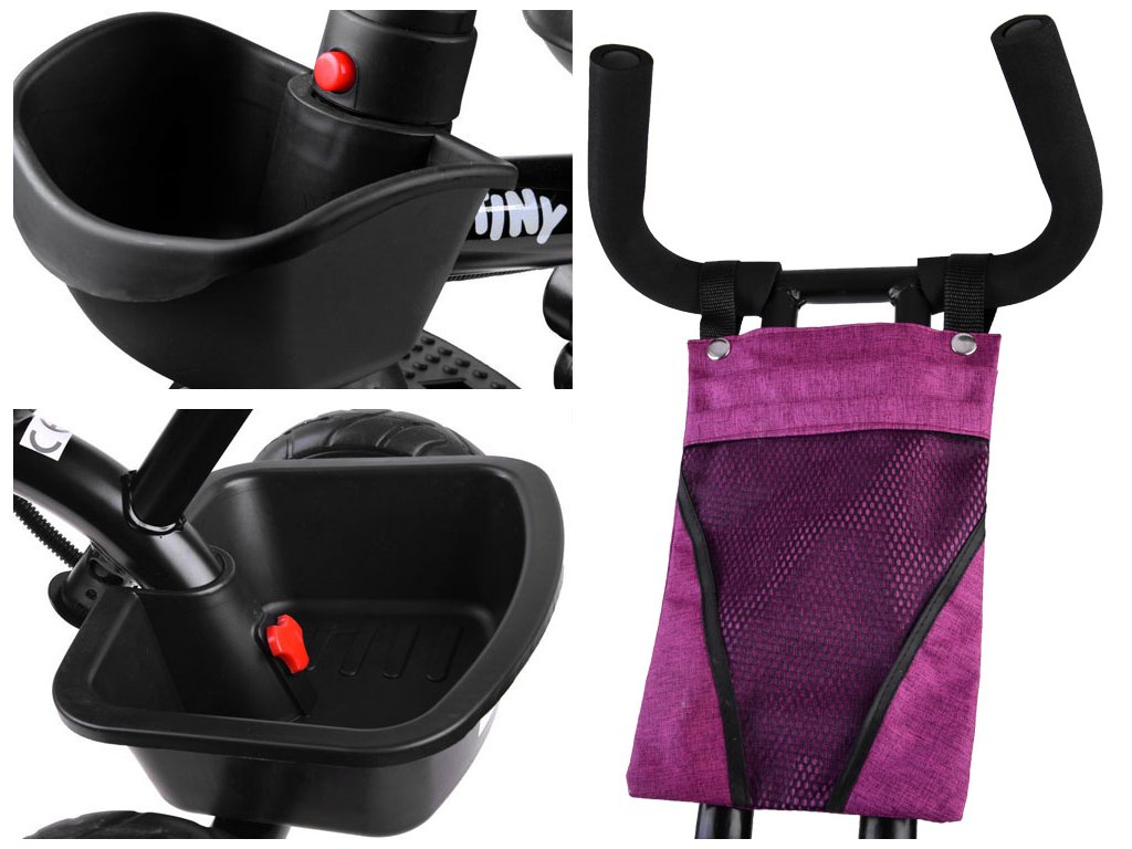 A kormányon van egy kis táska a szülőknek, ebbe lehet elrejteni pénztárcát, telefont, kulcsokat, gyümölcslevet vagy uzsonnát a gyereknek. Két kosár a triciklihez rögzítve: egy kicsi és egy nagy, könnyen elférnek a gyermekjátékok.