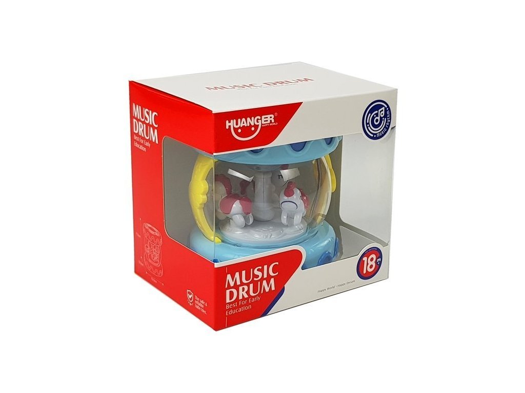 Hračka má ovládání hlasitosti a světelné efekty. Další atrakcí, která upoutá pozornost dítěte, je kolotoč s koníky uvnitř bubnu.