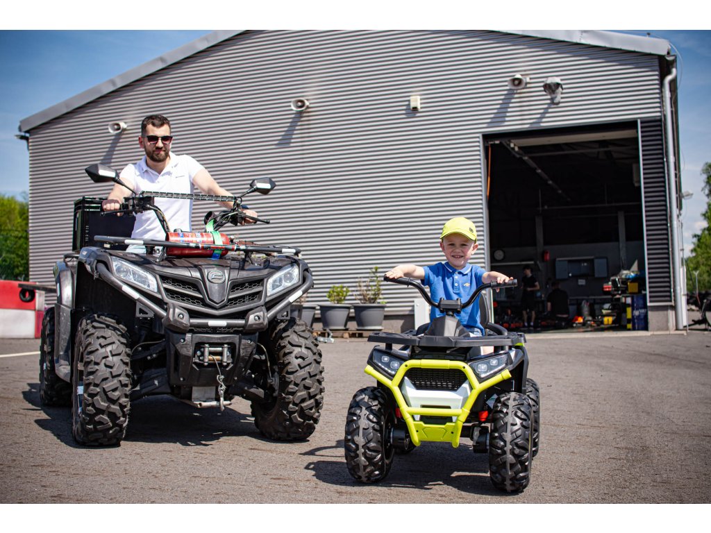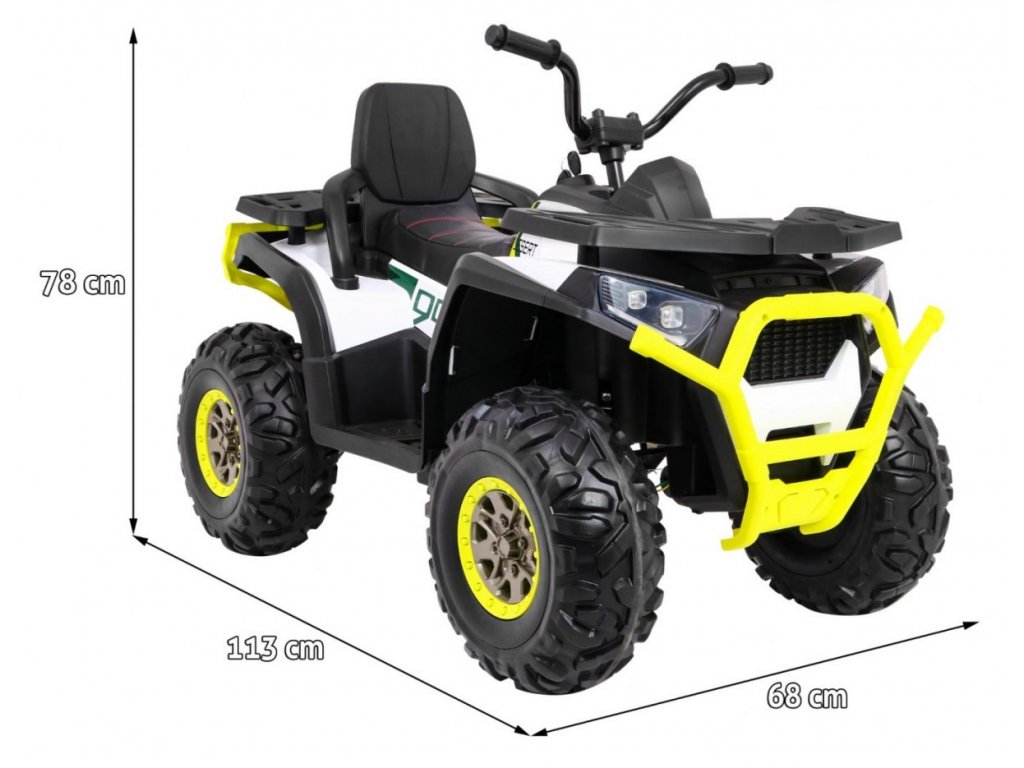 A gyermek elektromos négykerekű négy villanymotorral és Eva anyagból készült széles kerekekkel van felszerelve. A quad könnyedén megbirkózik a különféle terepen, burkolatlan felületekkel és dombokkal.