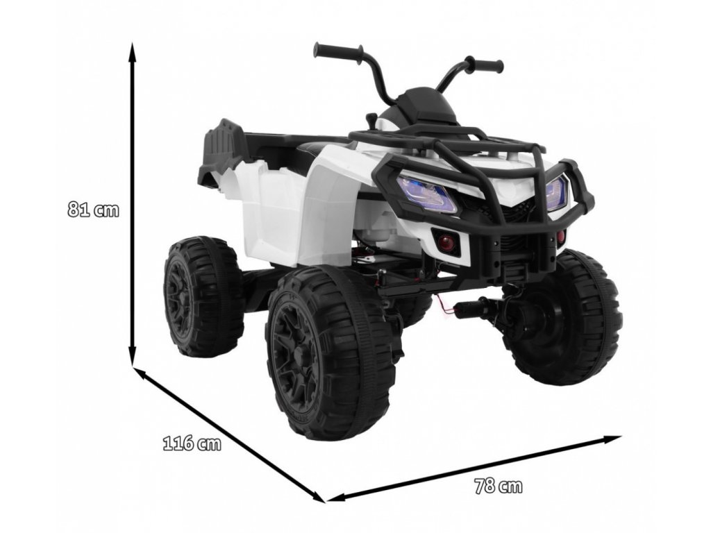 Az ATV XL gyermek elektromos négykerekű 12V 10Ah kapacitású akkumulátorral és négy 45W teljesítményű motorral rendelkezik, ami azt jelenti, hogy a négykerekű 4x4 -es hajtású. Az EVA hab kerekek és az ökológiai bőrből készült ülés gondoskodik a kényelmes utazásról.