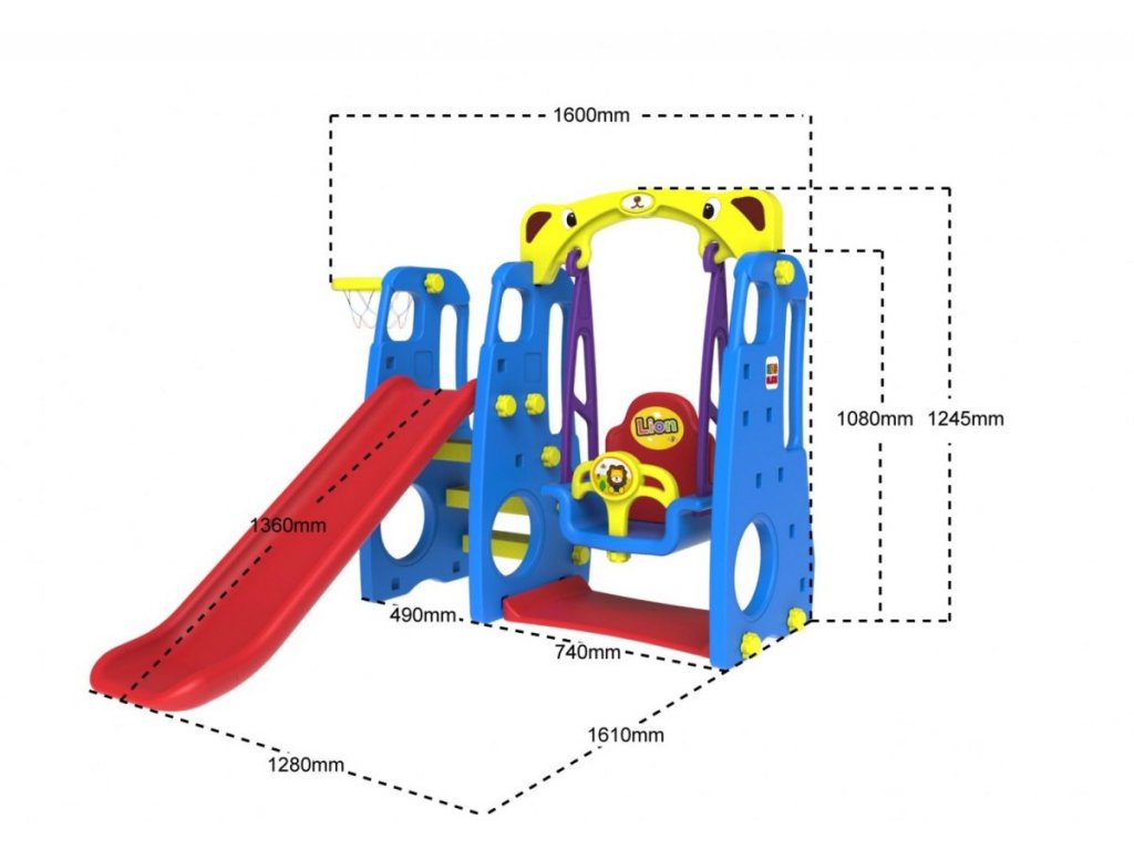 Kerti hinta csúszdával és kosárlabda karikával . A készlet kétféleképpen összecsukható, a kosár jobb vagy bal oldalon. A csúszda a gyermek életkorától függően elhelyezhető. A készlet beltéri és kerti használatra is alkalmas. Minden fal és alkatrész kétrétegű műanyagból készül. Megfelelő korosztály 1 éves kortól. A termék európai CE biztonsági tanúsítvánnyal rendelkezik.