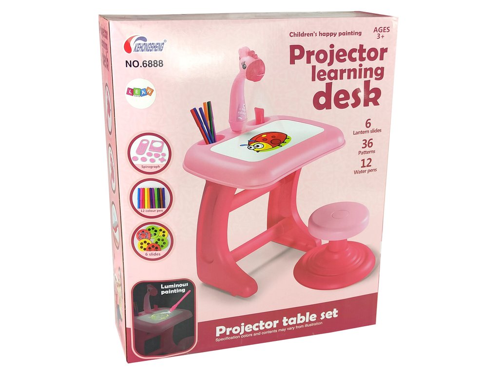 A készlet tartalmaz egy kis széket, melynek köszönhetően gyermeke kényelmesen ülhet az asztalnál. A zsámoly és a szék rózsaszín színű, tökéletes kiegészítője lesz a gyerekszobának. Az asztallapon két kis fiók található, amelyekbe a tollak egész sorát el lehet rejteni, mindig kéznél vannak. Az asztal közepén elhelyezett projektor egy zsiráfra emlékeztet. Különböző képeket mutat be állatokkal, amelyek papírra újrarajzolhatók. A készletben található sablonok megtanítják gyermekét a geometriai formák helyes elnevezésére és a betűk írására.